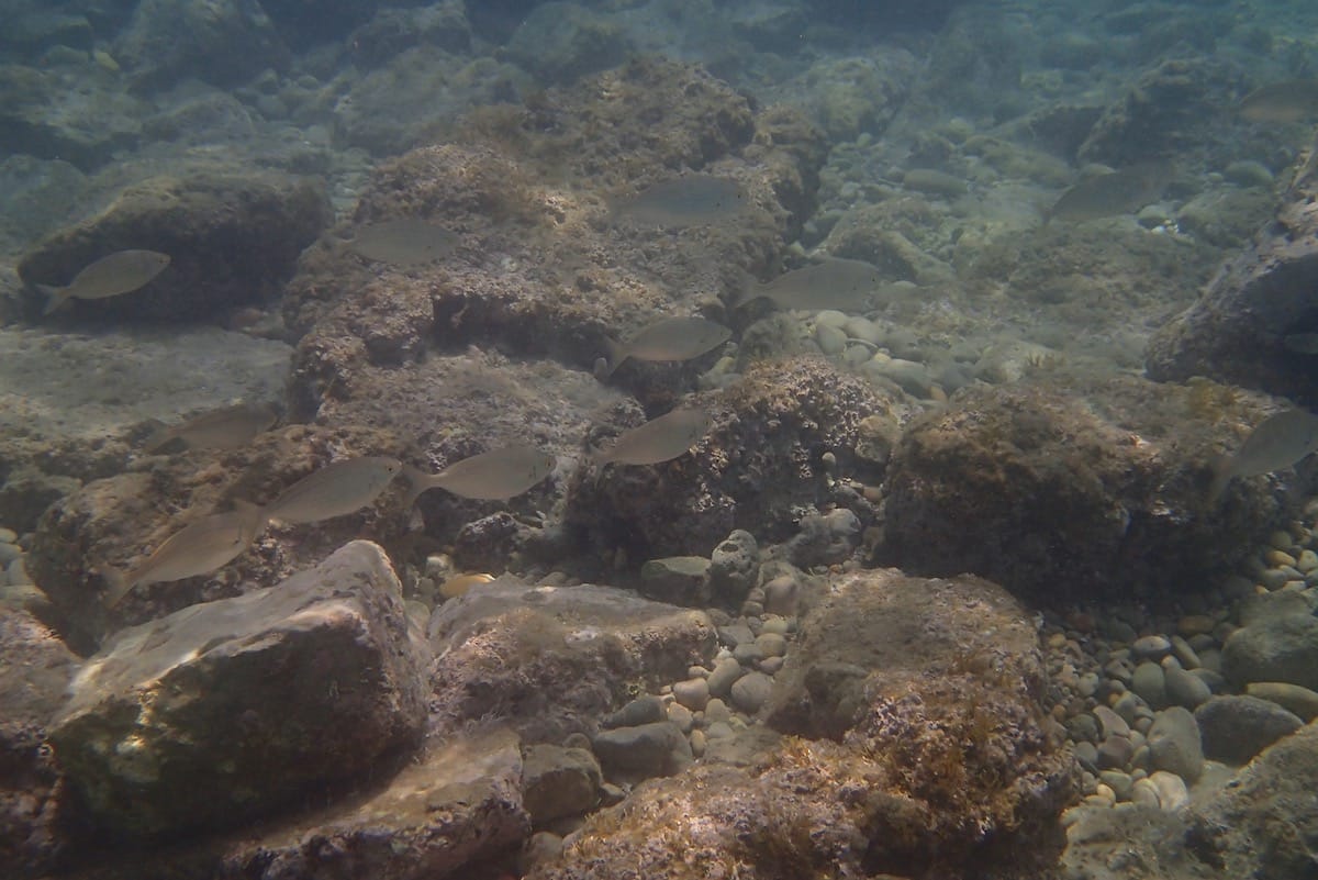 Des bancs de petites saupes de Méditerranée vont et viennent au-dessus des fonds, ainsi que quelques sars, des labres, et même de petits bars.