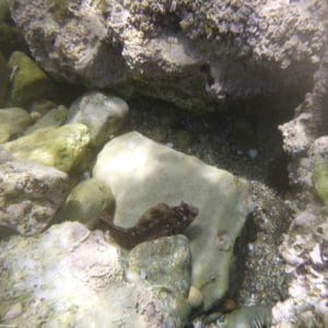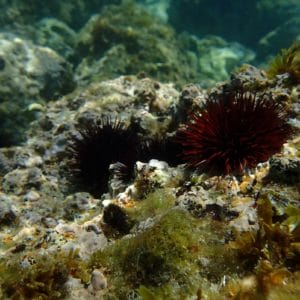 Les fonds marins sont couverts de rochers, certains colonisés par des algues, des anémones de mer, des oursins et une multitude de bernard l’hermite.