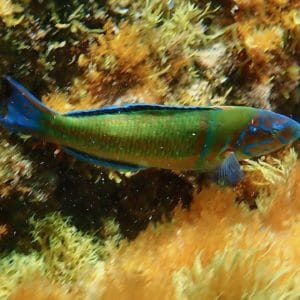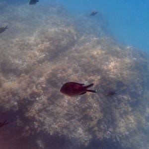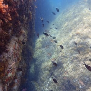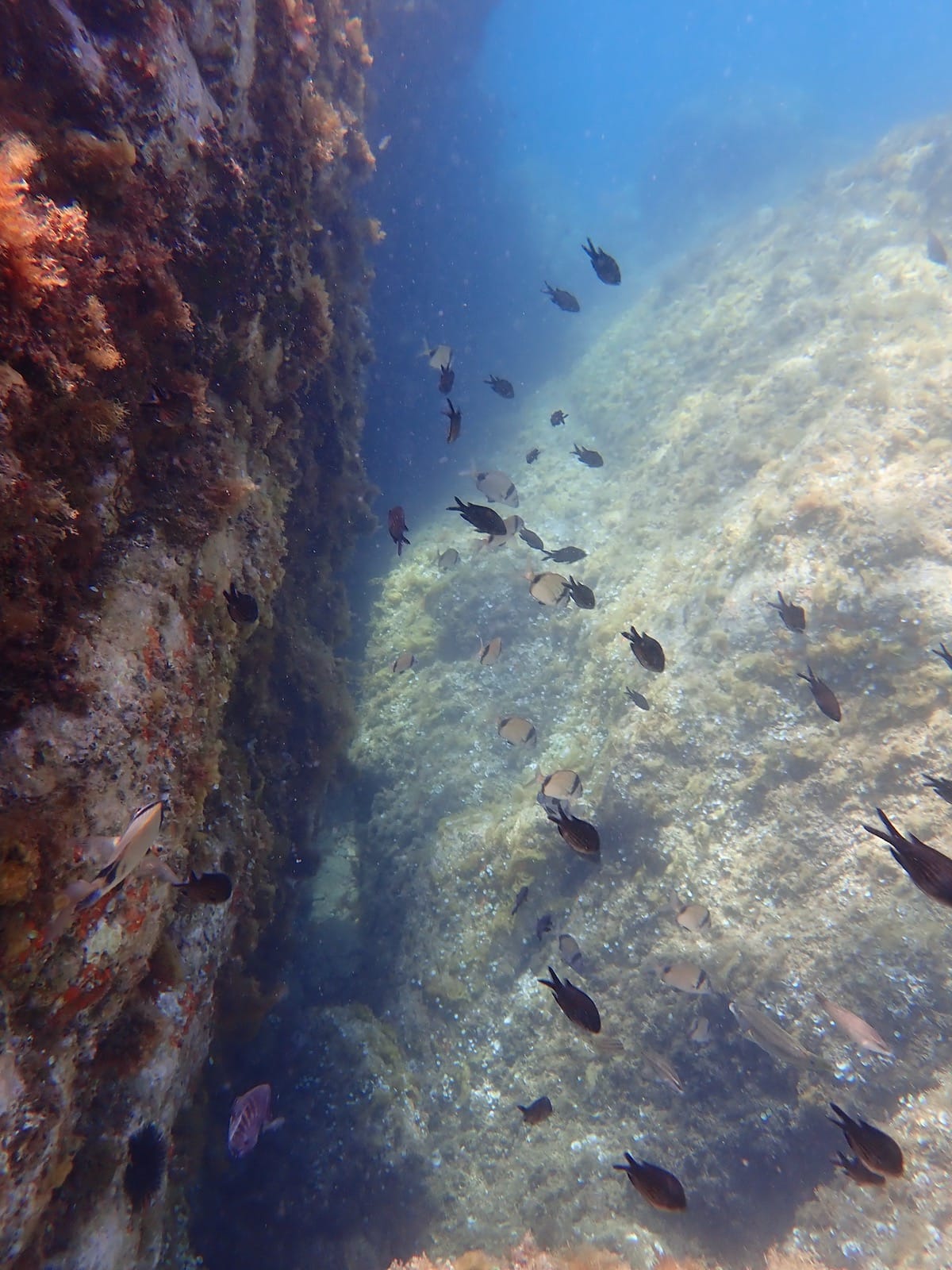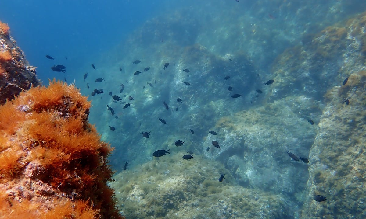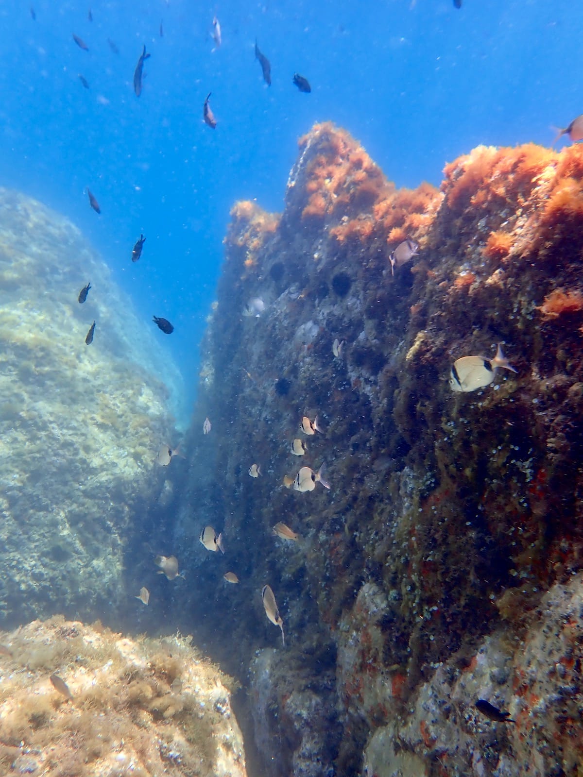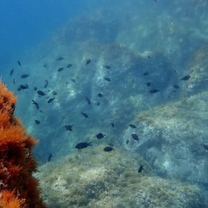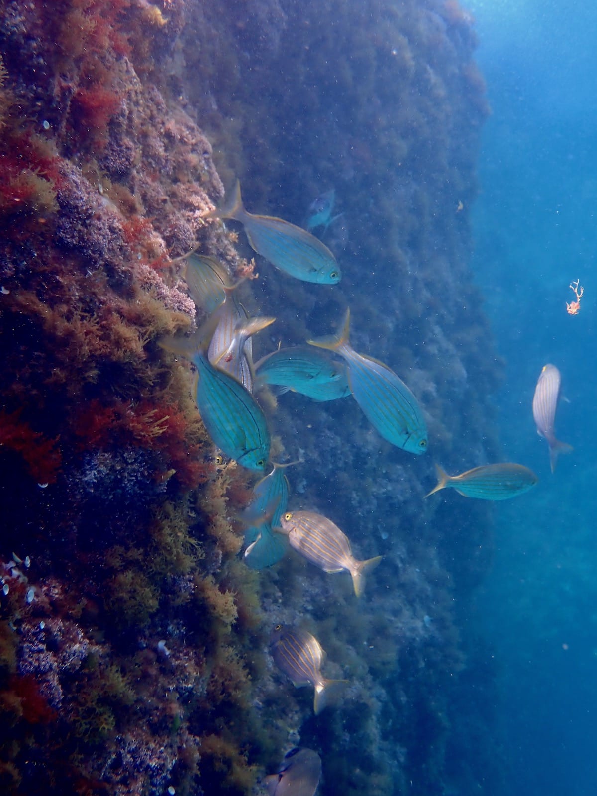 Une fois arrivé au niveau de la pointe, on découvre de superbes tombants (↕3-10m) autour desquels gravitent des centaines de castagnoles, de petits groupes d’oblades et des bancs de sars à tête noire. Parfois, on aperçoit aussi une dorade filant dans le bleu. En arrivant vers la petite plage, vous traverserez des crêtes couvertes d’algues (↕1,5-3m) où s’agitent de nombreuses girelles paon.