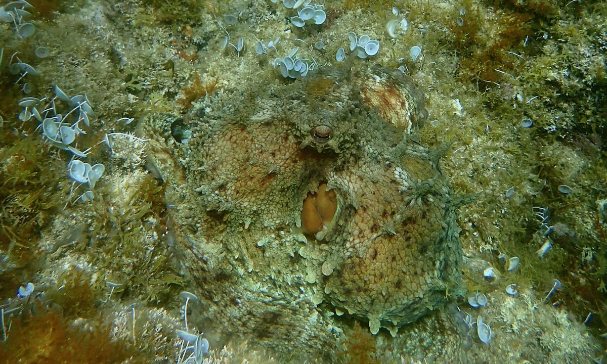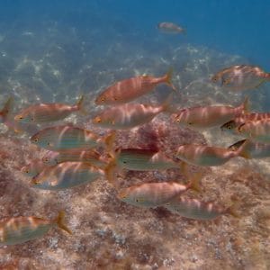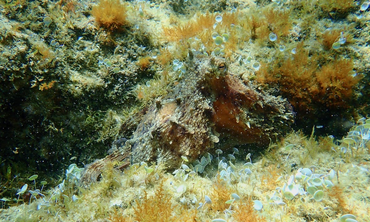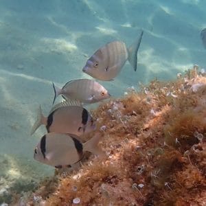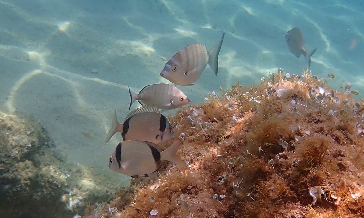 Dans les petits fonds (↕1-1,5m), on peut voir de nombreux sars communs, sars à museau pointu et sars à tête noire. De jolis bancs de saupes nagent de rocher en rocher, à la recherche des petites algues dont elles se nourrissent. Un peu plus loin, la hauteur d’eau augmente et les rochers forment des failles dans lesquelles se cachent parfois des poulpes communs.