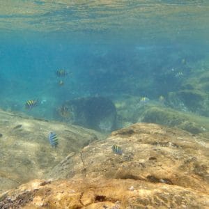La zone de snorkeling couvre la petite baie qui se trouve à gauche de l’îlot. Le paysage sous-marin est varié, avec de nombreux rochers et de belles étendues de sable. A certains endroits, les rochers sont couverts de différentes variétés d’algues, de petites éponges et d’oursins.