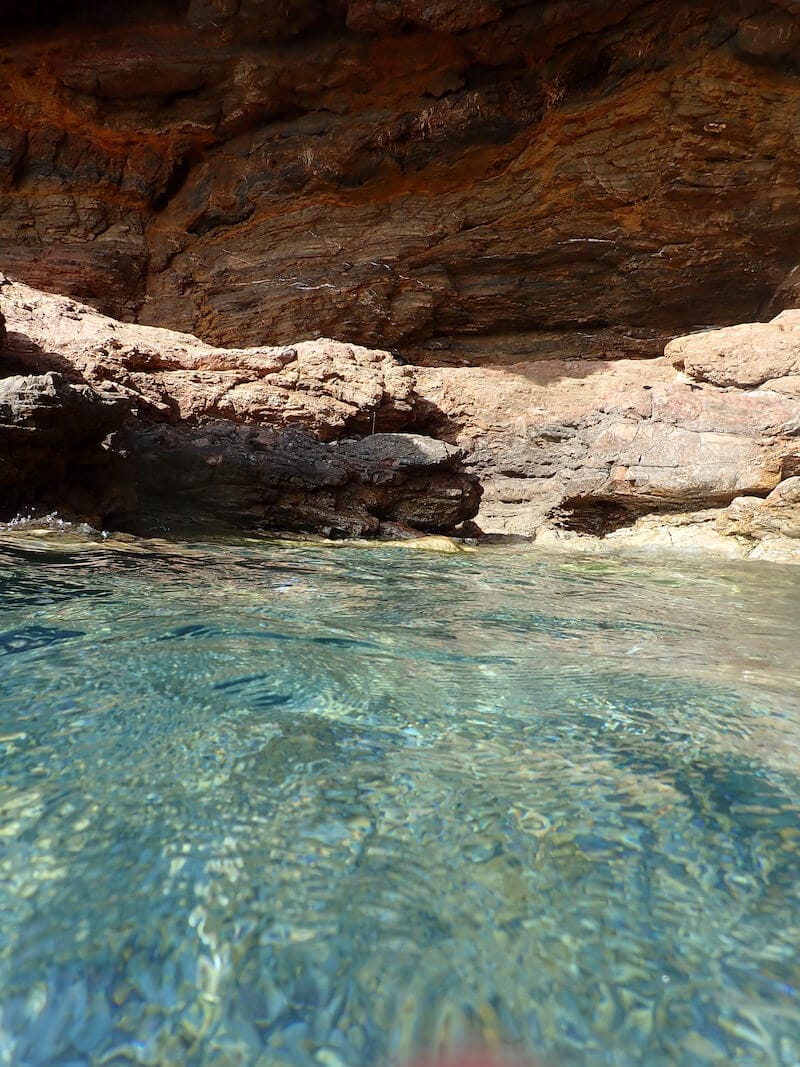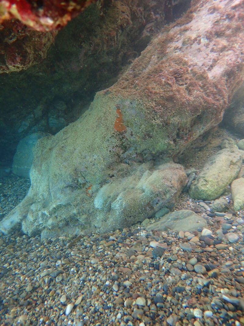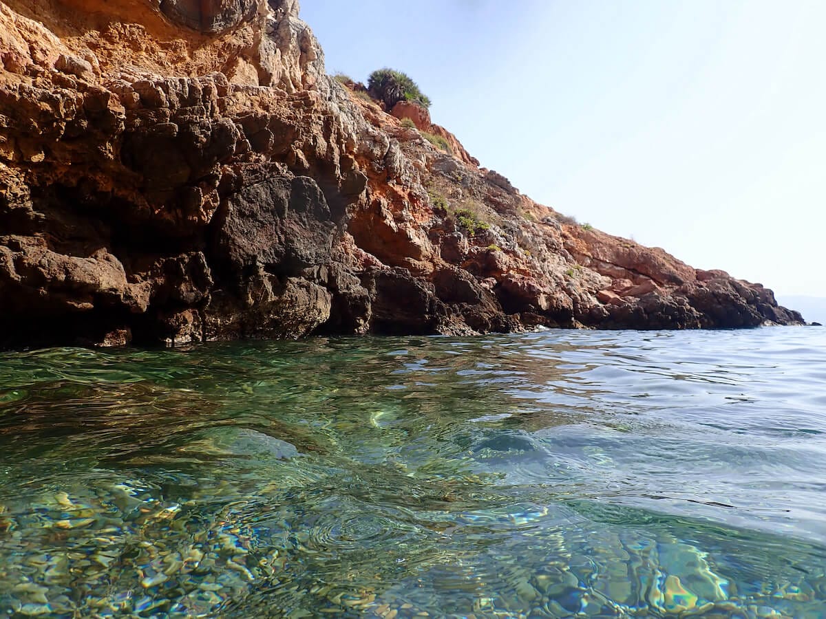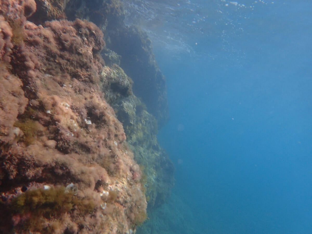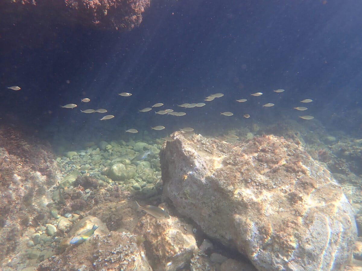 Depuis la plage, longez le rivage rocheux qui borde d’Est de la baie. Vous pourrez tout d’abord découvrir de nombreuses petites grottes et surplombs creusés dans la roche. Une grande variété d’algues, de même que des polypes et des éponges, ont colonisé les parois. On observe plusieurs espèces d’oursins dans cette zone, notamment des oursins noirs et des oursins granuleux.