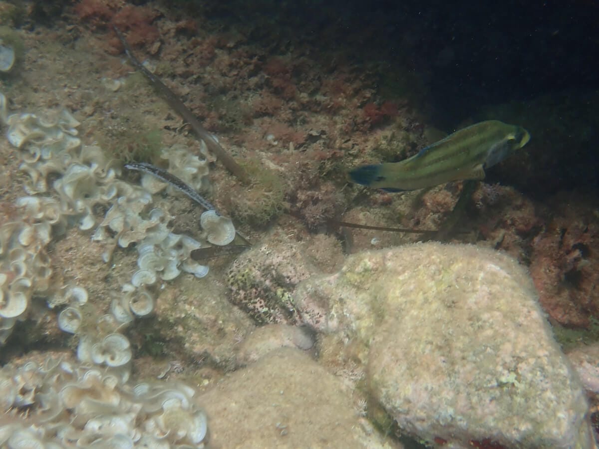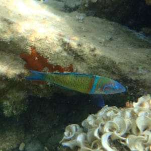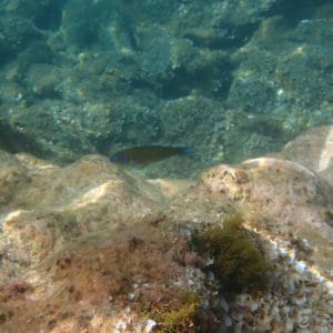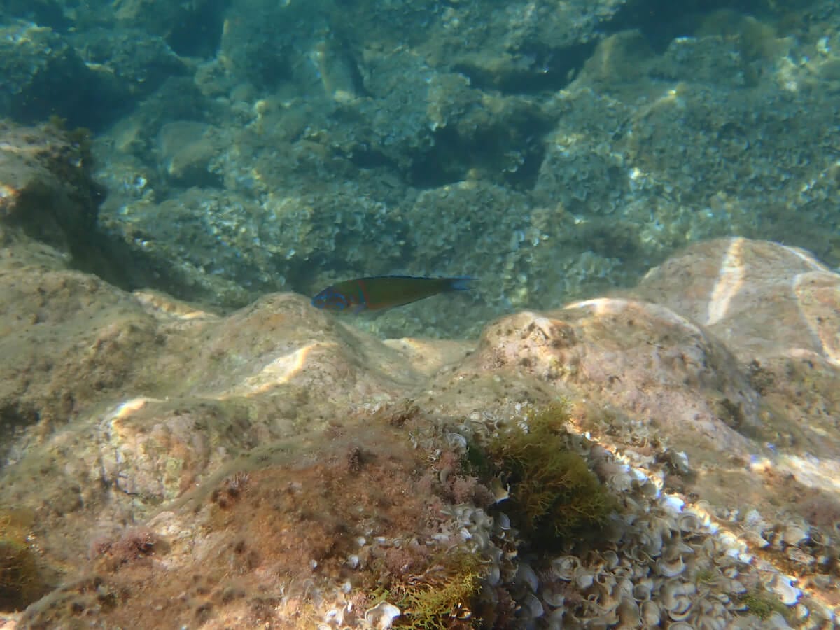 Après environ 50m, vous arriverez dans une sorte de petite crique peu profonde, aux fonds couverts de galets. Des girelles-paon, aux couleurs éclatantes, virevoltent autour des rochers. Si vous le souhaitez, continuez à longer le bord après la crique. La profondeur augmente et quelques massifs de posidonie viennent ponctuer les fonds.