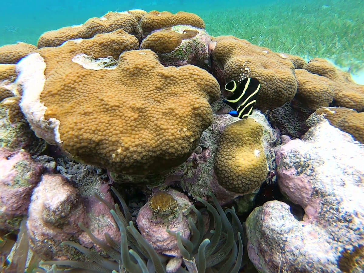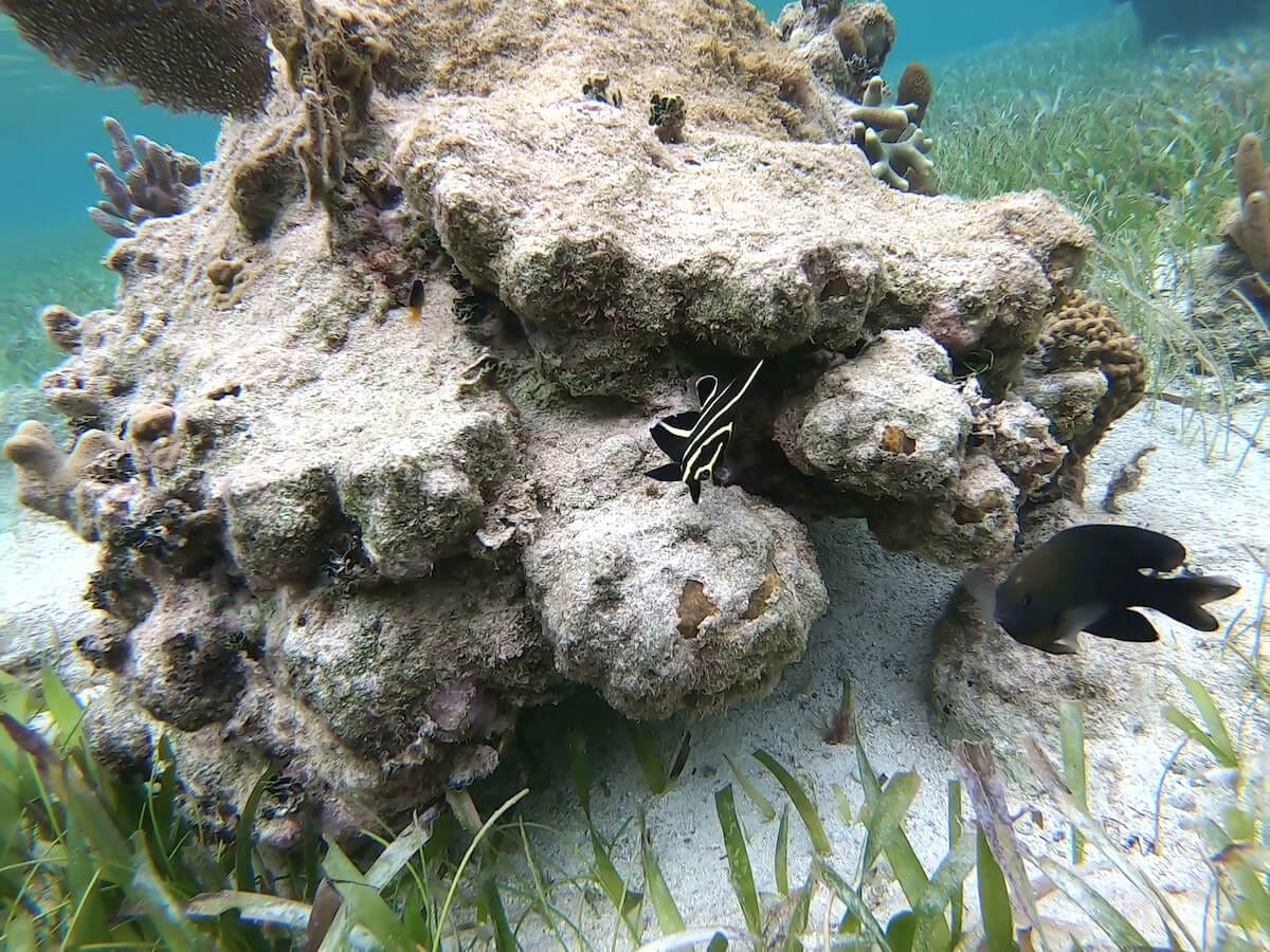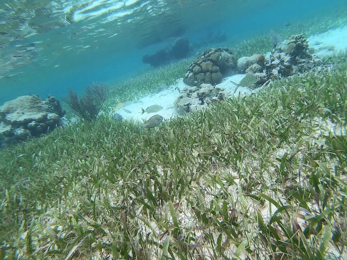 La diversité de poissons est superbe. Demoiselles, poissons-anges français, gorettes (plusieurs espèces) et sergents majors se regroupent autour des patates de corail, tandis que des blanches cendrées traversent de temps à autre les herbiers.