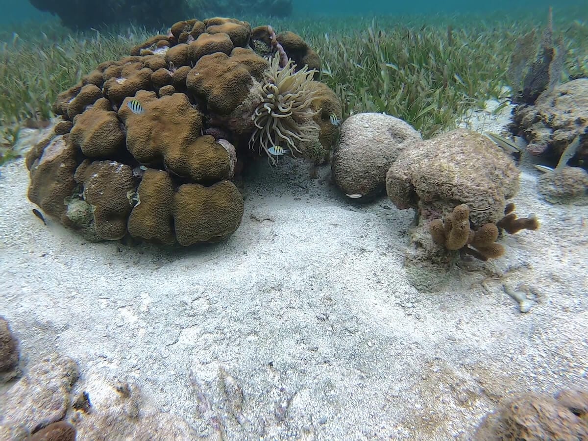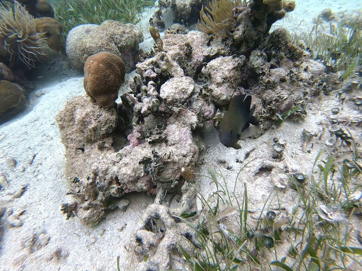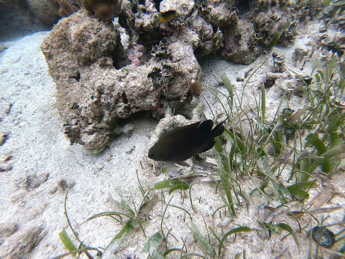 La diversité de poissons est superbe. Demoiselles, poissons-anges français, gorettes (plusieurs espèces) et sergents majors se regroupent autour des patates de corail, tandis que des blanches cendrées traversent de temps à autre les herbiers.