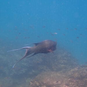 Le snorkeling à Punta Espinoza consiste à palmer le long de la côte volcanique et accidentée. La topographie du site consiste en des récifs rocheux graduels couverts d’algues qui descendent du rivage.