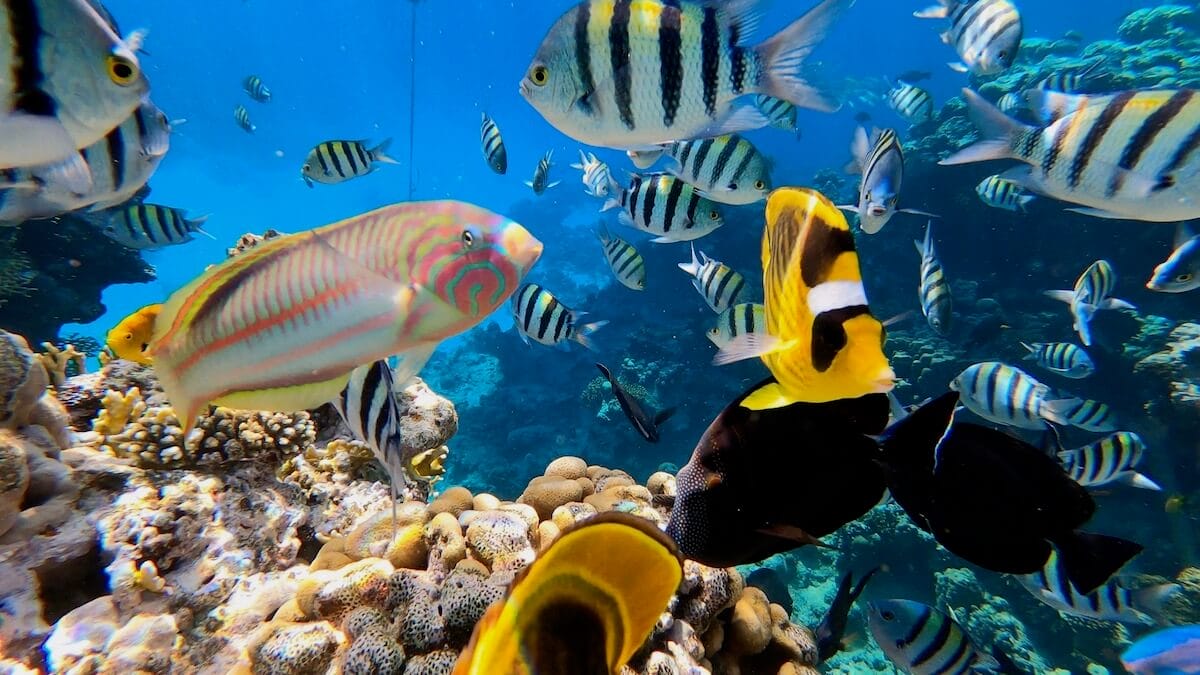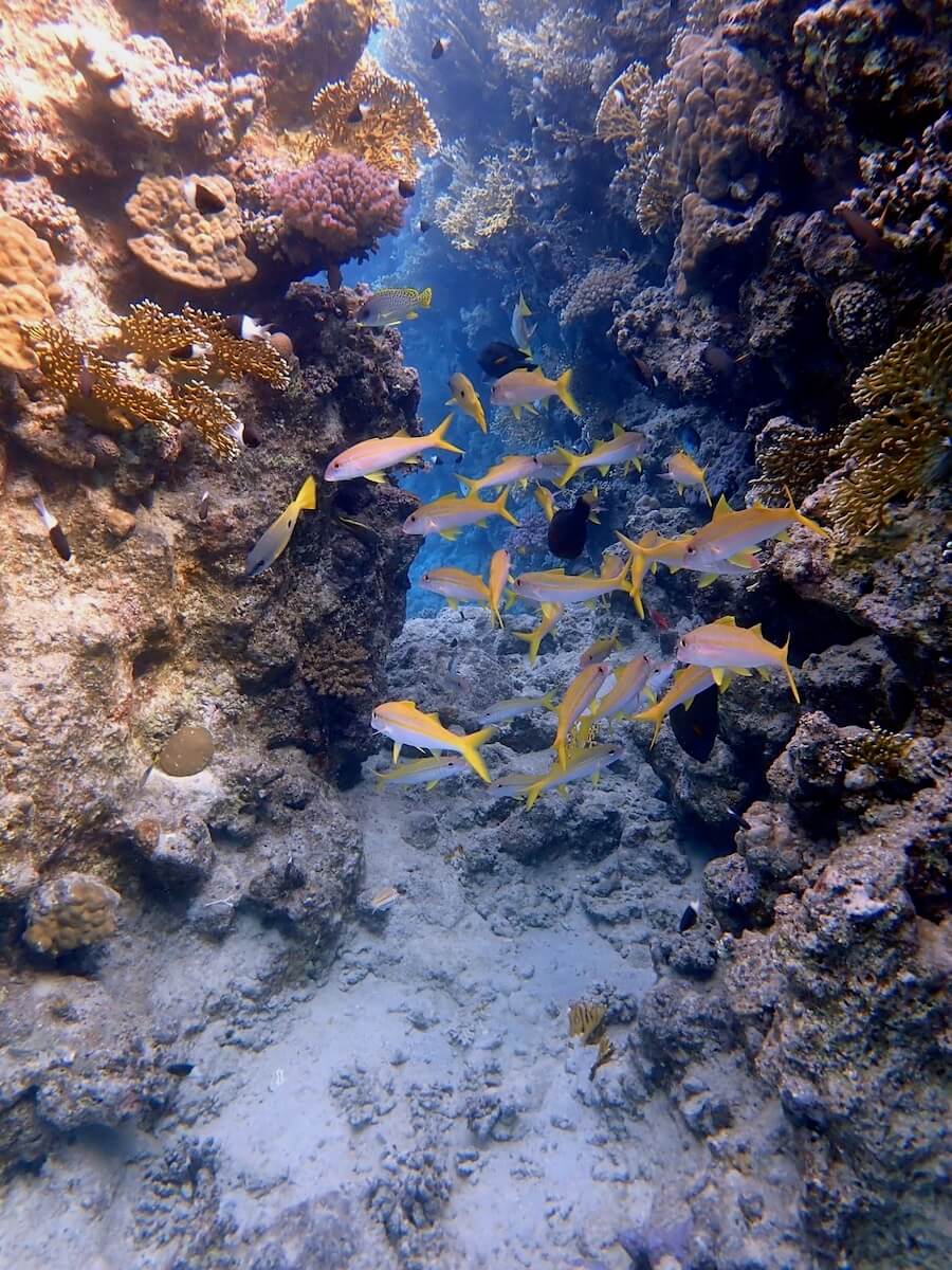 Autour du récif gravite un éventail d’espèces typiques de Mer Rouge: des centaines de sergents majors qui pullulent juste sous la surface, des chirurgiens zébrés, plusieurs espèces de poissons-papillons, des poissons-perroquets, et de petites groupes de poissons-cochers de Mer Rouge qui stationnent le long du tombant.