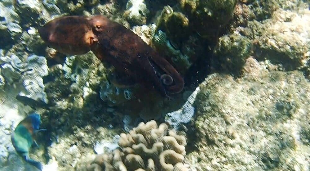 Les fonds rocheux sont également le milieu idéal pour repérer les murènes, souvent vues en train de sortir la tête des crevasses, ainsi que des calmars et des poulpes. De nombreuses tortues vertes visitent les eaux abritées de la baie, où elles peuvent se reposer et se nourrir sur des rochers recouverts d’algues.
