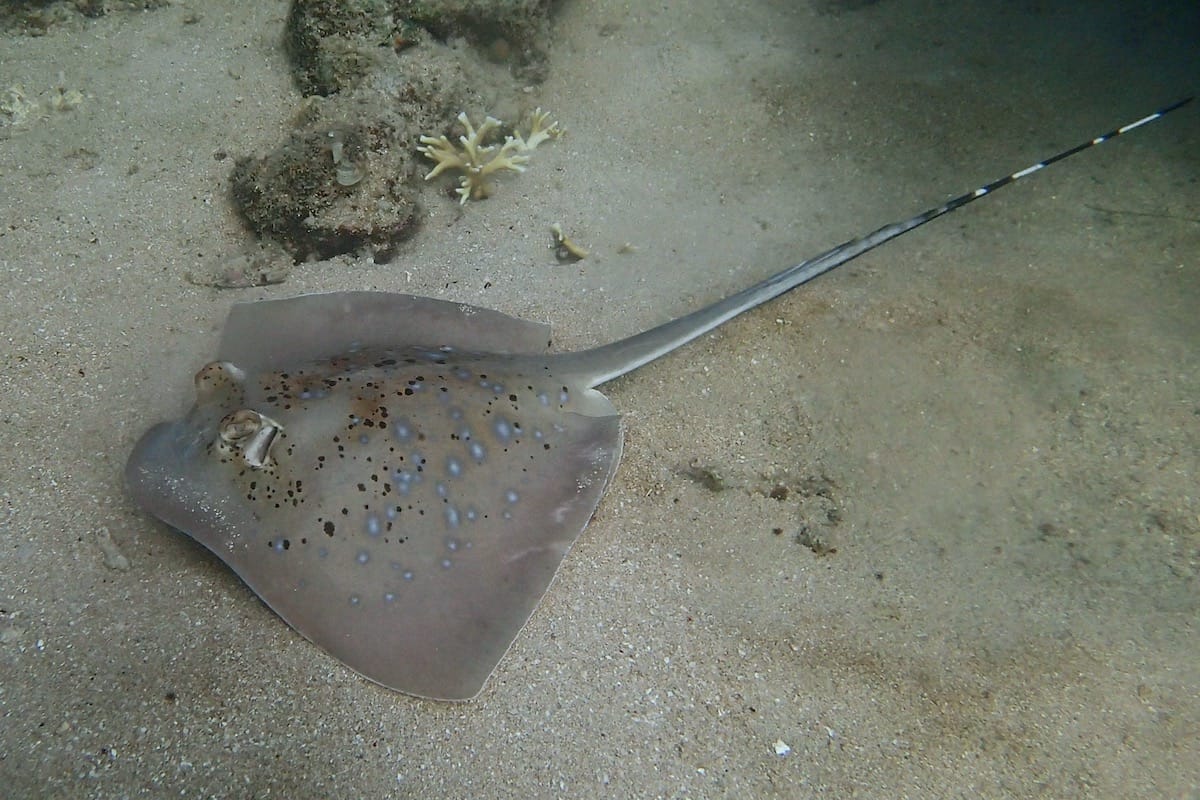 De nombreux sergents majors à queue en ciseaux et sergents majors de Whitley vivent aussi près de la surface. Avec un peu de chance, vous pourriez aussi voir une raie pastenague masquée à points bleus, assez commune dans la baie.