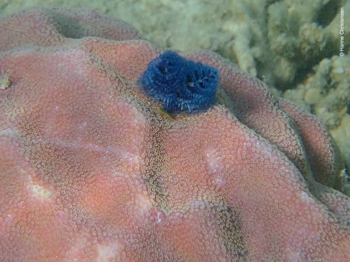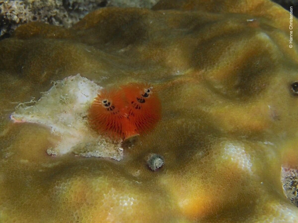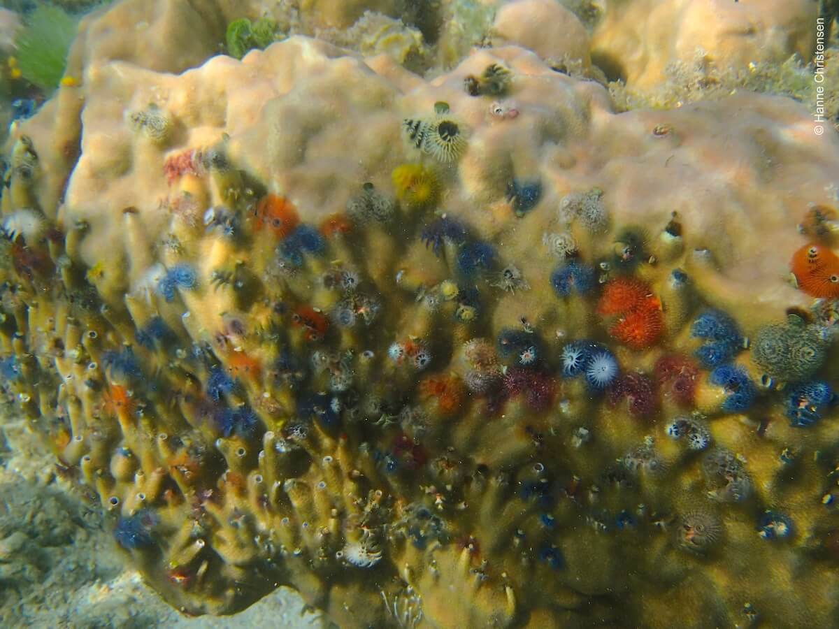 En partant du bord, on peut explorer un récif peu profond (↕1-3m), toutefois assez pauvre en coraux. Les fonds sont principalement parsemés de corail massif poreux, dans lequel sont incrustés des centaines de spirobranches-arbre de Noël de toutes les couleurs et de nombreux bénitiers.