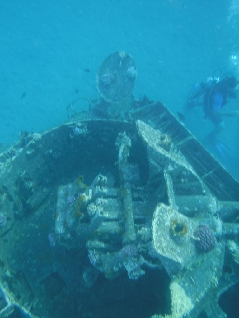 À environ 200m au sud du ponton, au pied du tombant, on découvre un tank immergé par environ 6m de fond. Celui-ci a été volontairement coulé en 1998 dans un but écologique, et joue aujourd’hui pleinement son rôle de récif artificiel. Il est couvert de coraux et attire de nombreux poissons.