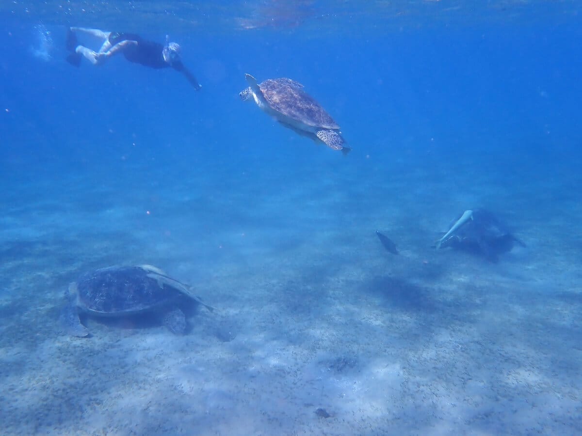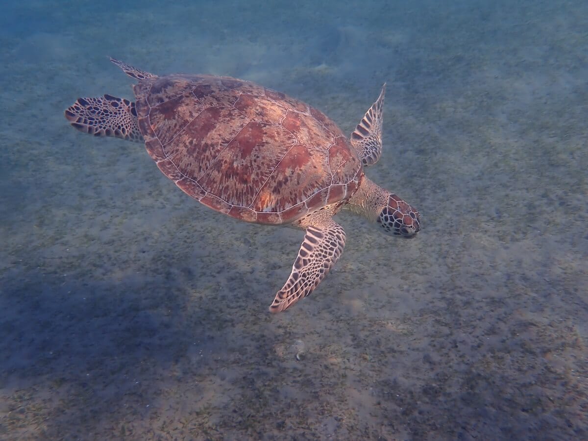 Le centre de la baie est sableux et abrite un herbier où se trouvent pratiquement tous les jours 5 ou 6 tortues vertes. On voit aussi parfois ici des raies-guitares, un poisson spectaculaire qui peut mesurer plus de 120 centimètres de long.