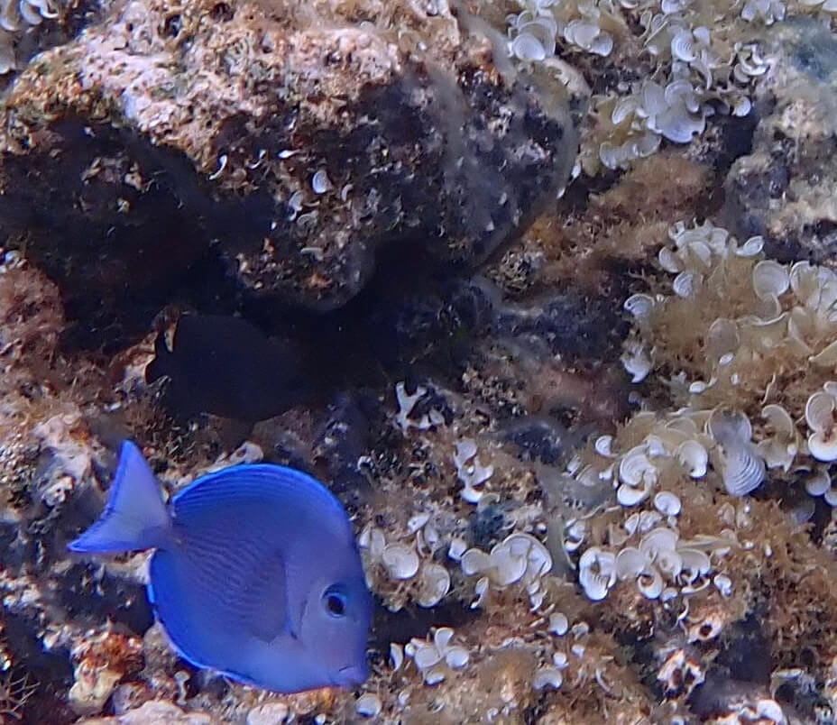 Avant de sortir de l’eau, jetez un oeil à l’immense platier couvert de gorgones qui s’étend à l’Est du spot. C’est le royaume des bancs de chirurgiens bleus, qui le parcourent inlassablement en broutant les petites algues qui poussent sur ces fonds aérés.