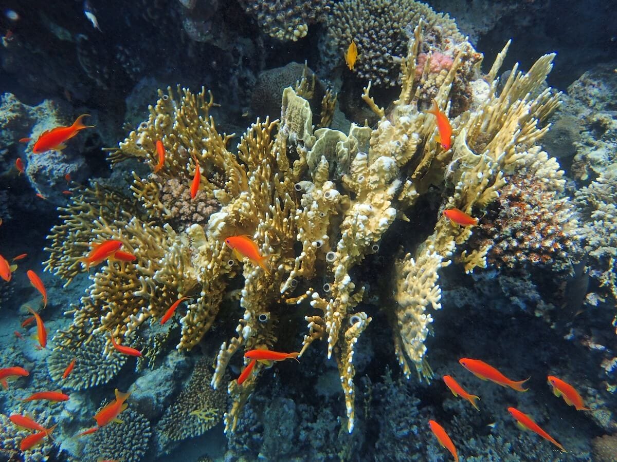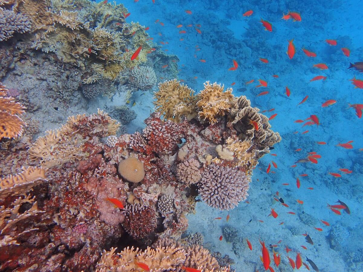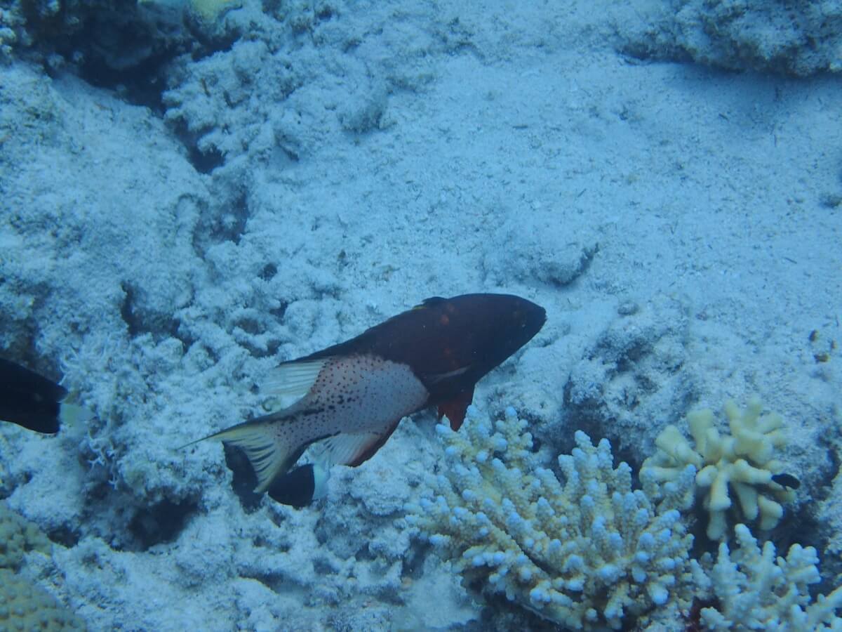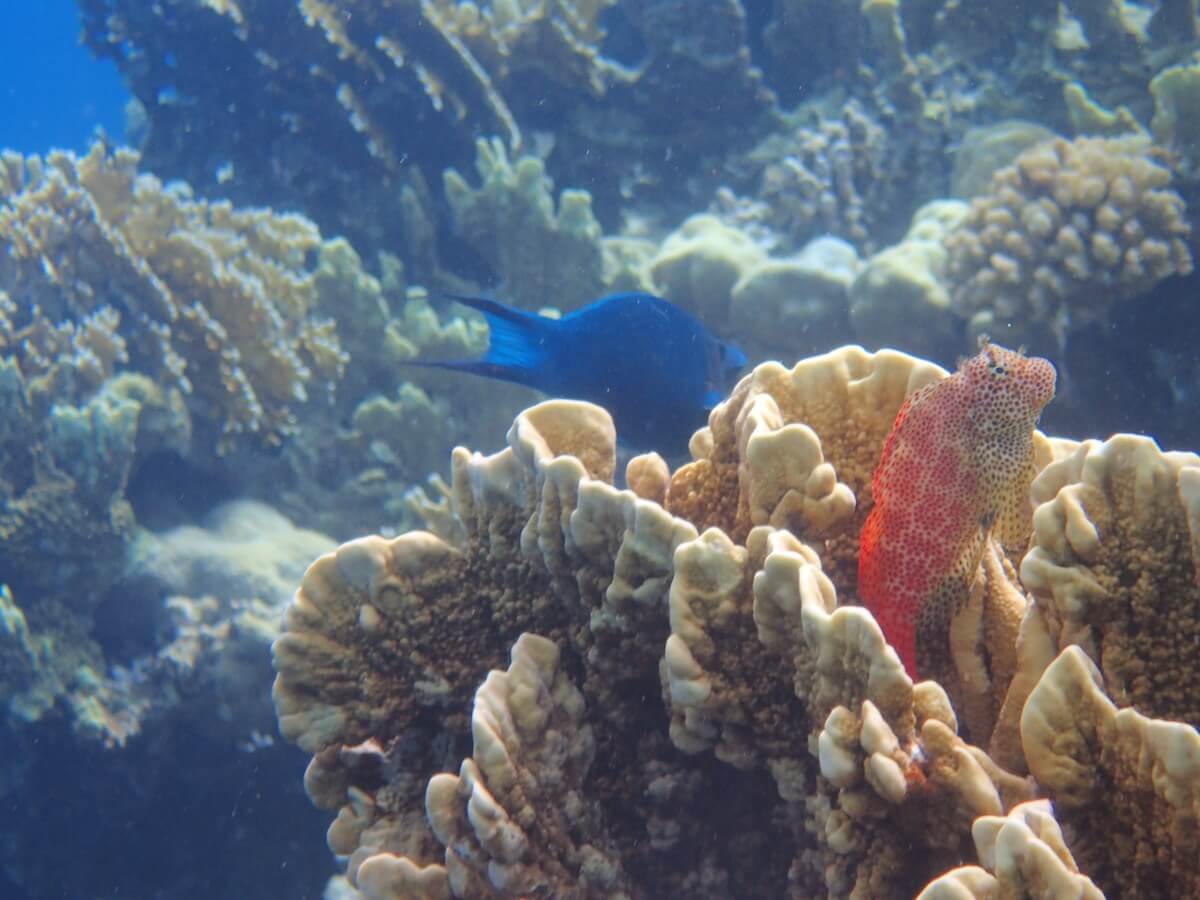Des mérous oriflamme, des poissons-éperviers à taches de rousseur et des blennie léopard sont souvent postés sur les coraux, se cachant entre leurs branches à la moindre alerte.