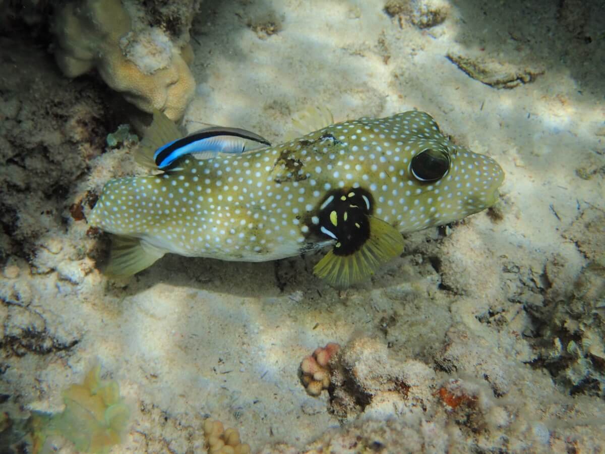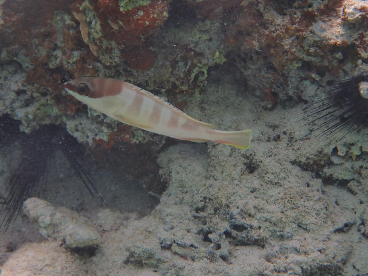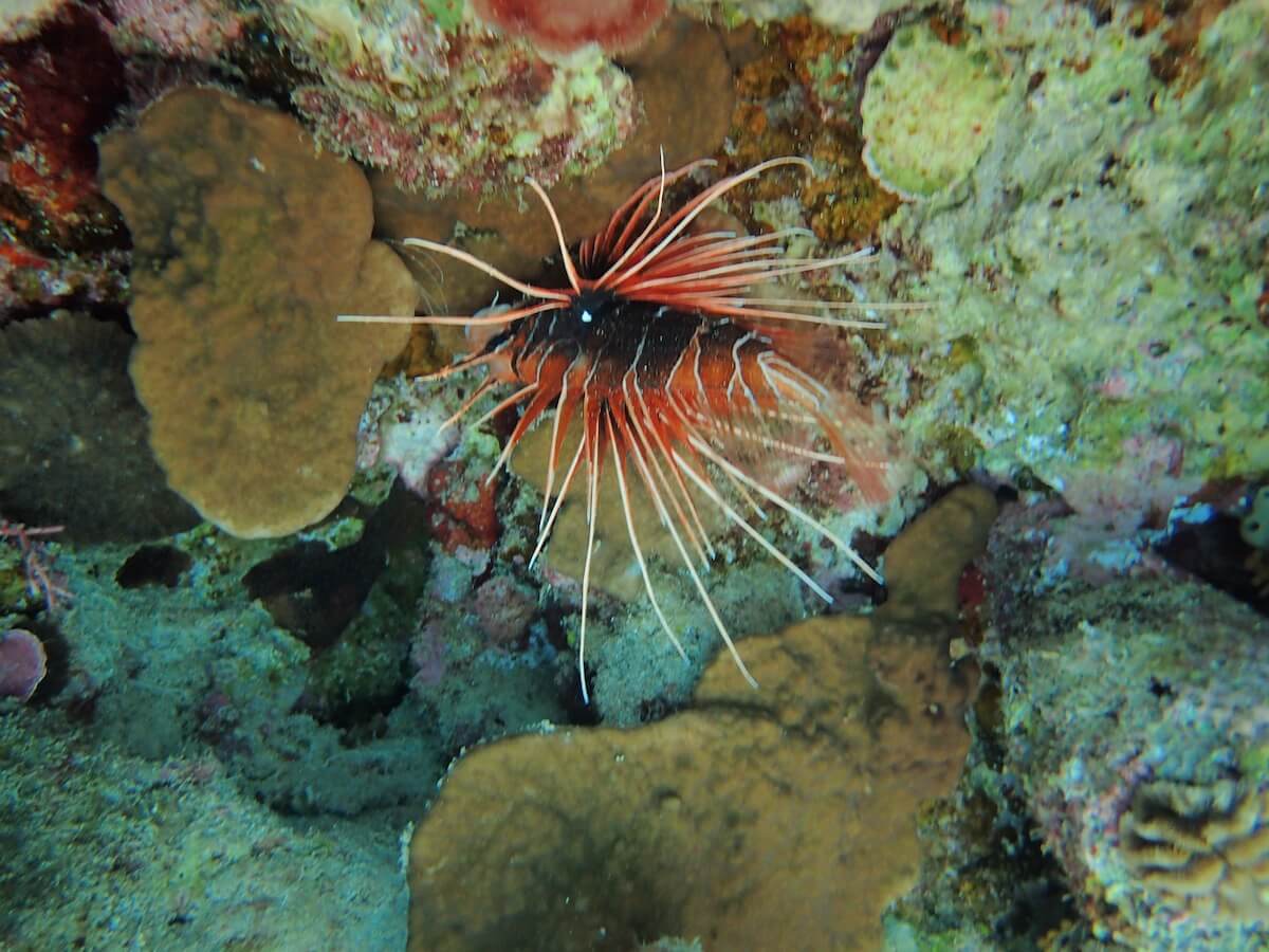 Une fois dans l’eau, commencez par explorer le lagon. Calme et peu profond, la hauteur d’eau n’y excède pas 2m. Les fonds du lagon sont assez pauvres et la vie sous-marine se concentre sur ses bordures, colonisées par du corail. De nombreux poissons-lions et poissons-scorpions à raies blanches se cachent dans ces zones, de même que plusieurs espèces de poissons-écureuils.