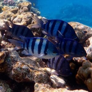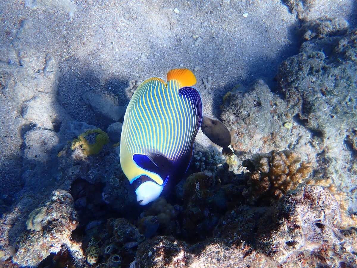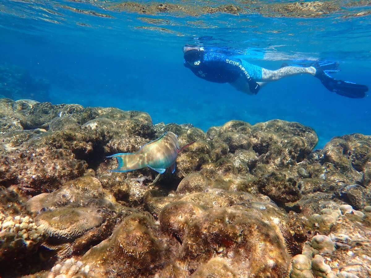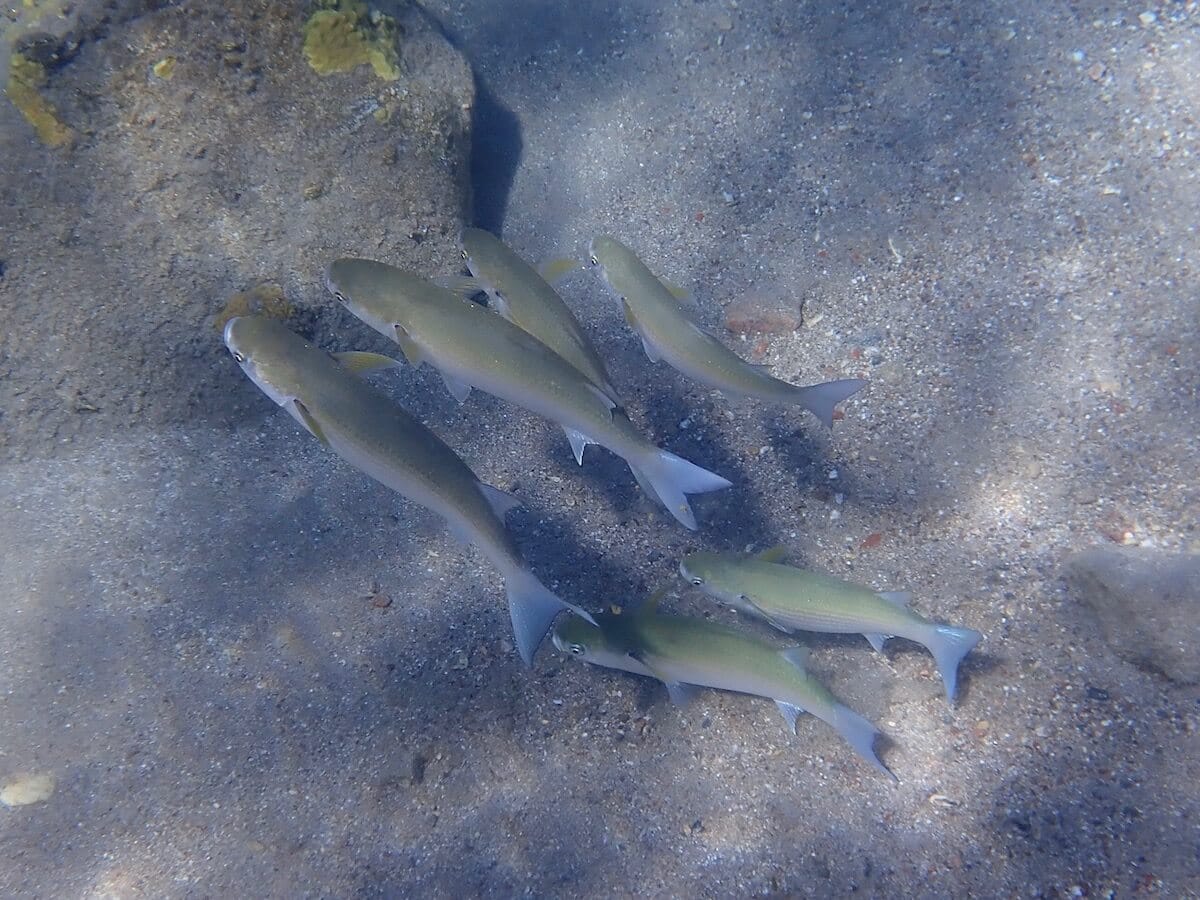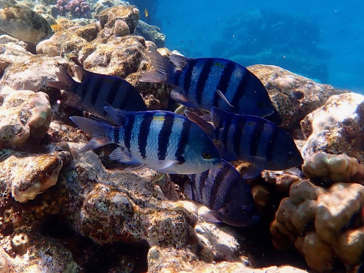 En palmant de récif en récif, on peut observer une vie sous marine riche et colorée. Sur les petits platiers, des chirurgiens zébrés sont occupés à brouter les petites algues, tandis que de nombreux sergents majors nagent sous la surface de l’eau. Ils sont parfois dérangés par le passage d’un énorme labre clown ou d’un poisson perroquet.
