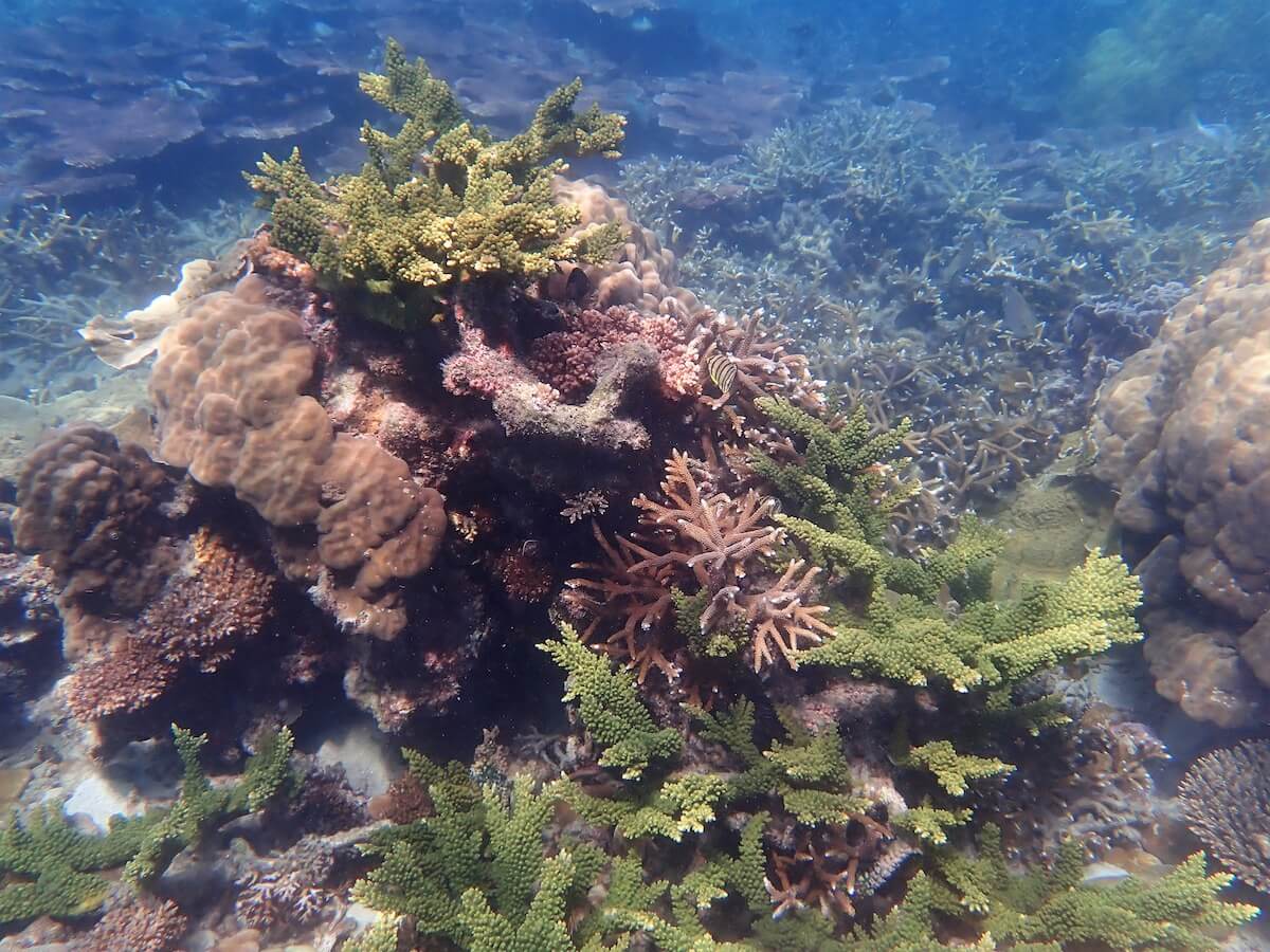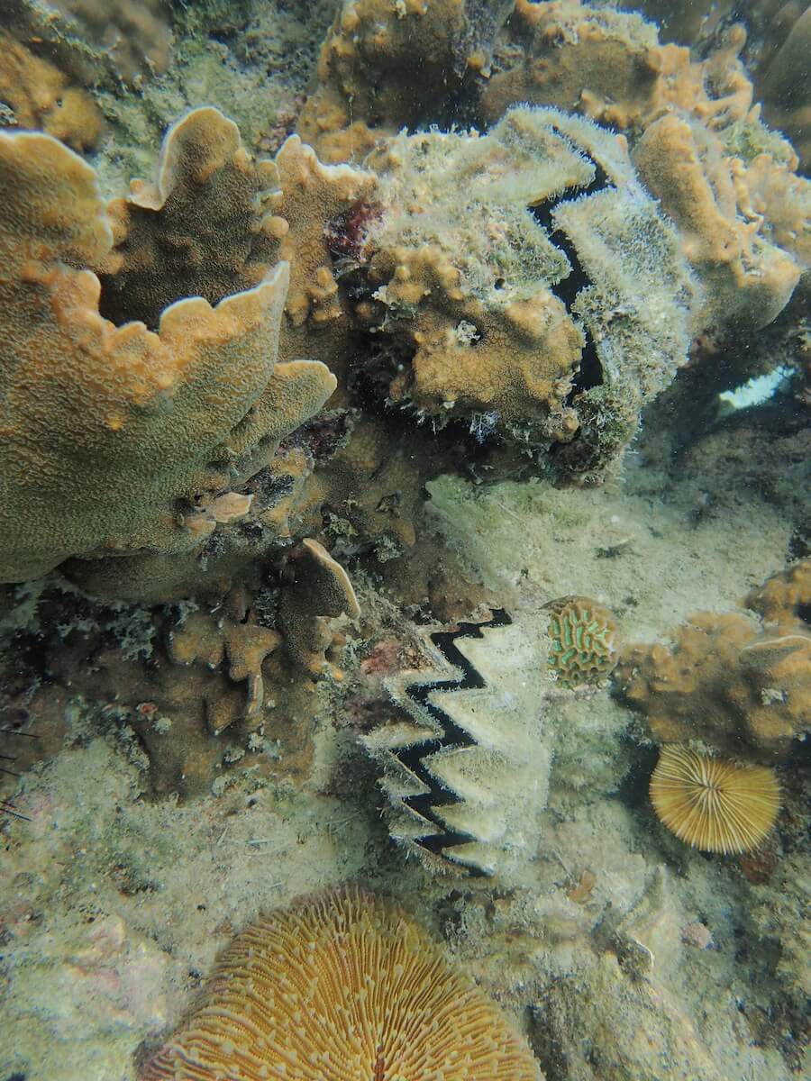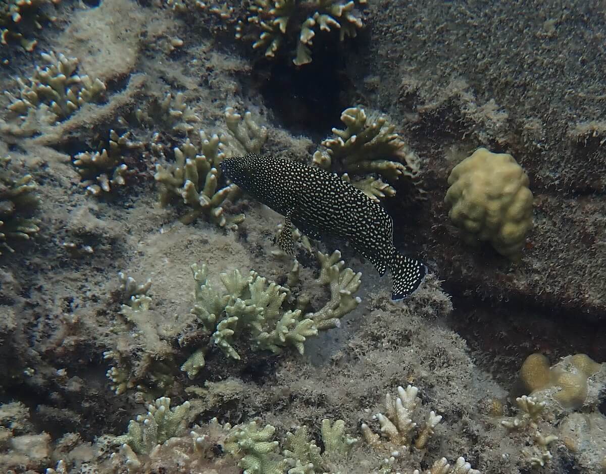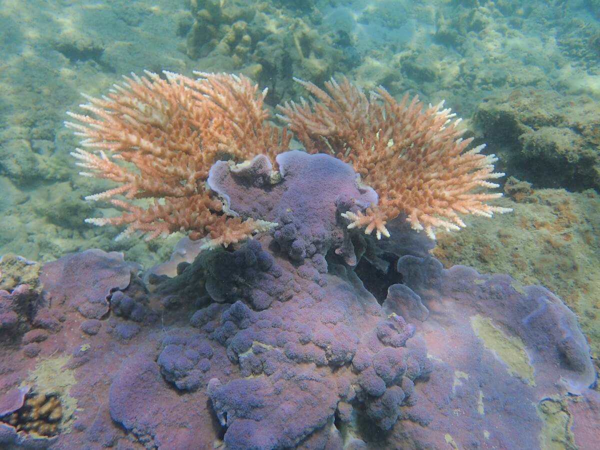 Les coraux de Tuna Bay sont globalement très abîmés. Même si certains massifs de coraux branchus, de Porites et de coraux digités sont encore en bonne santé, on traverse aussi de grandes zones de débris coralliens morts.