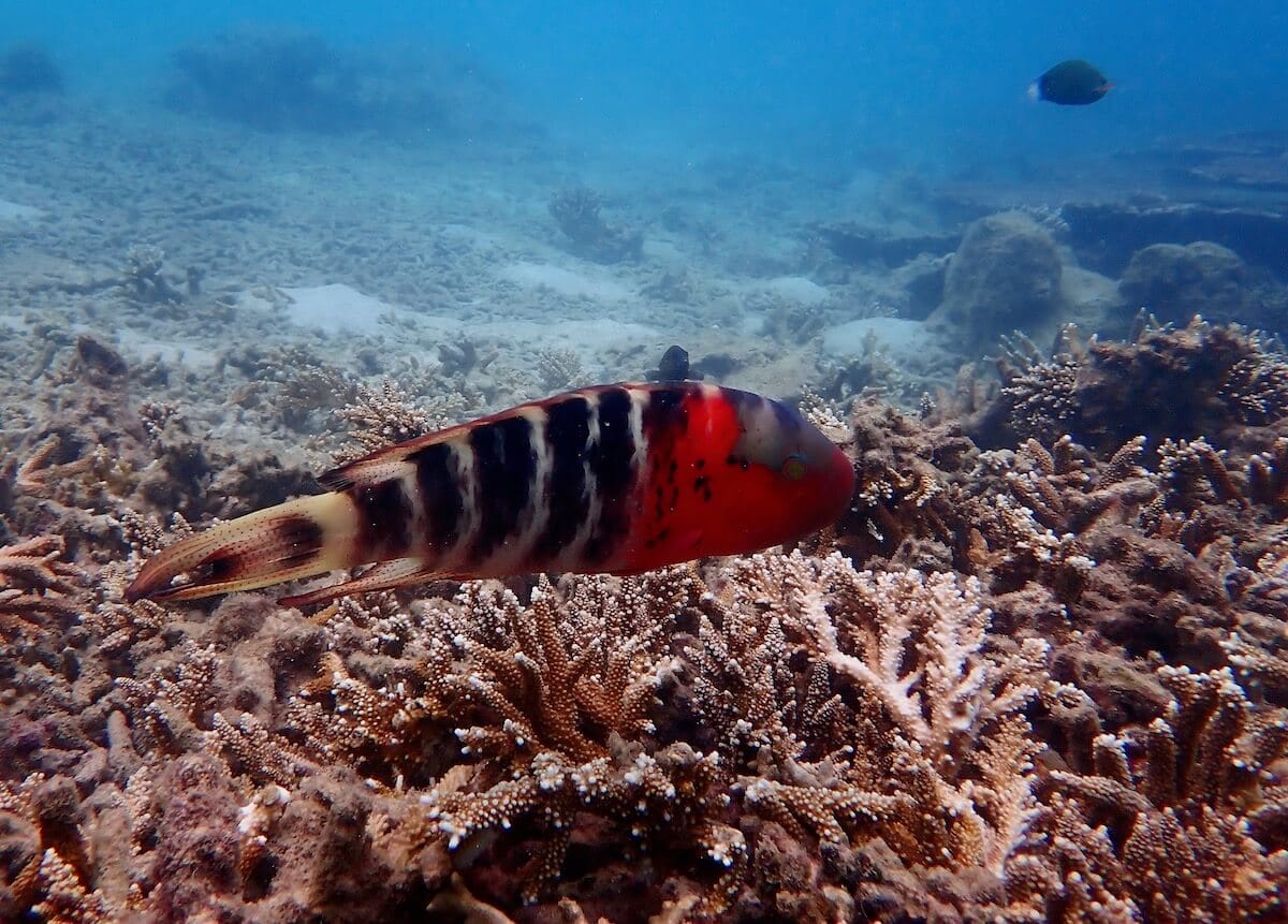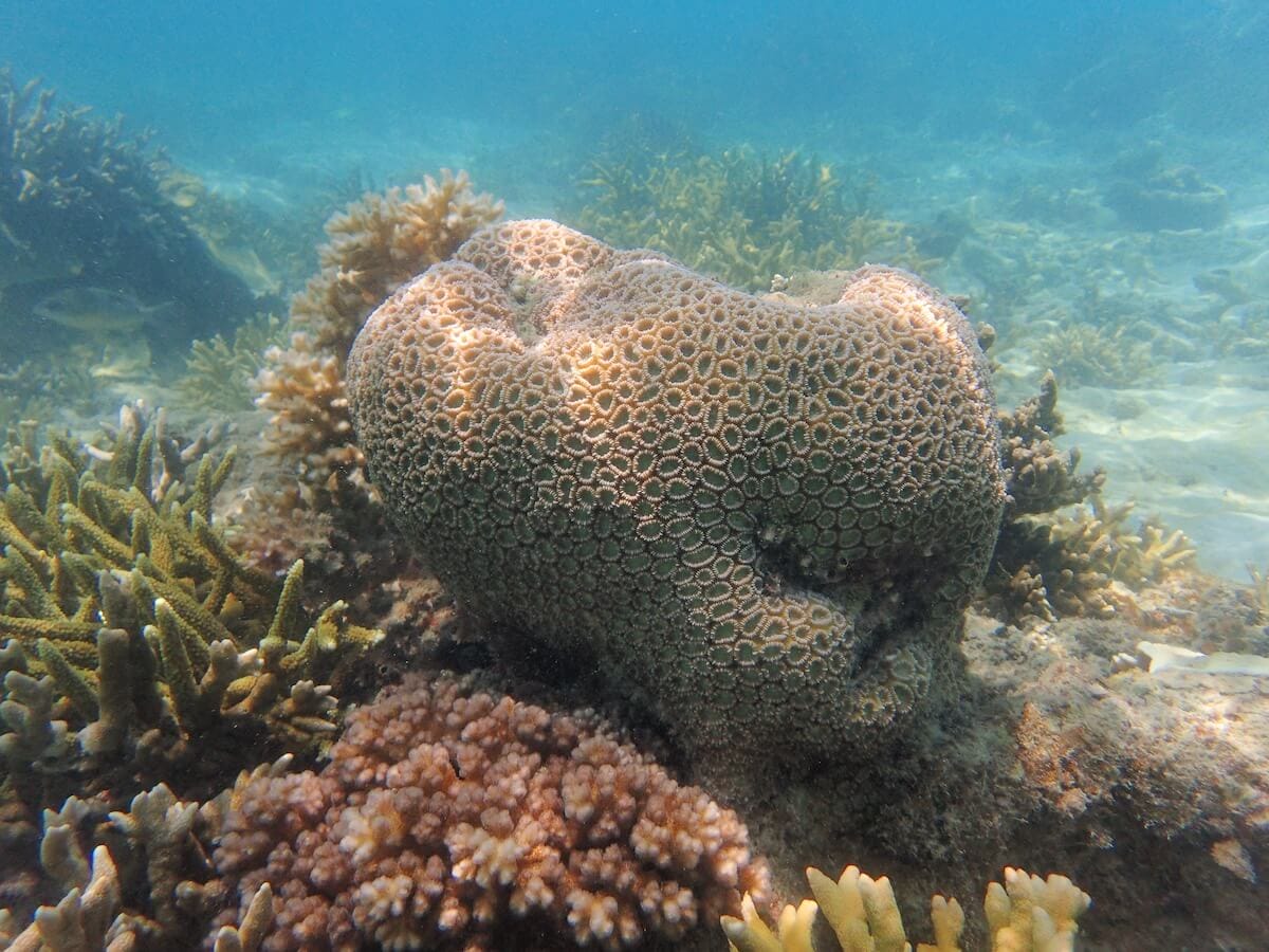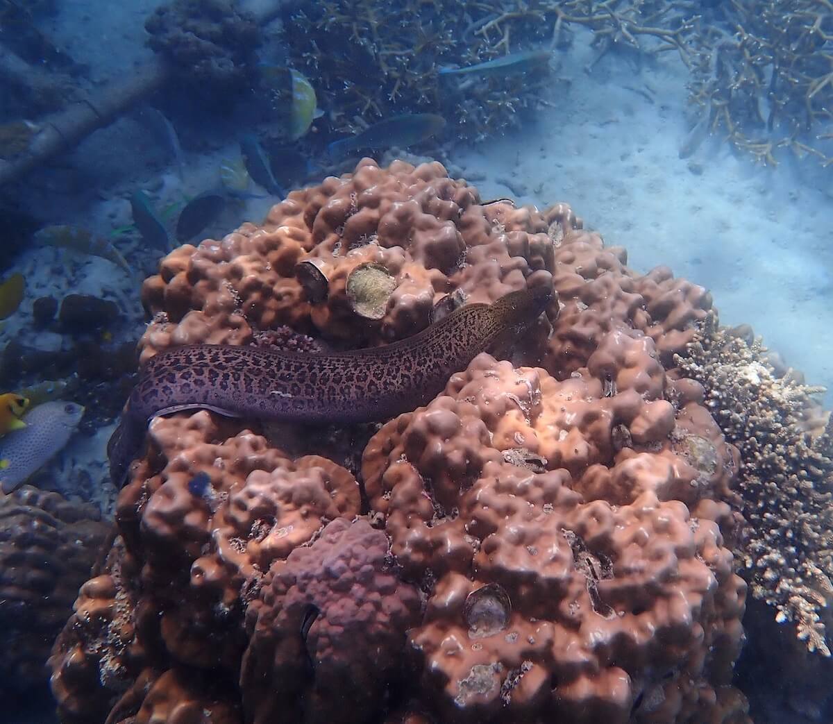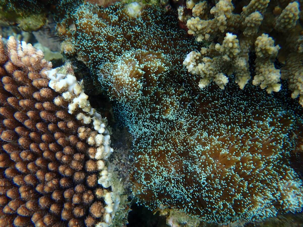 Les coraux de Tuna Bay sont globalement très abîmés. Même si certains massifs de coraux branchus, de Porites et de coraux digités sont encore en bonne santé, on traverse aussi de grandes zones de débris coralliens morts.