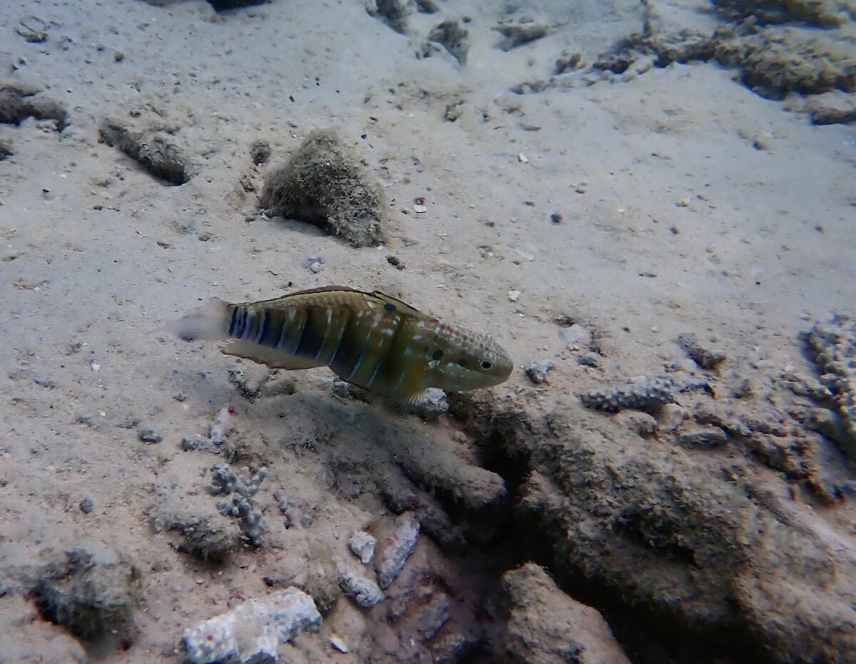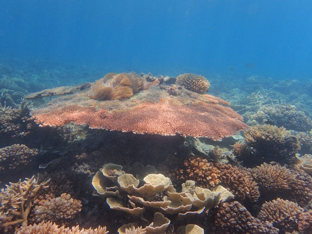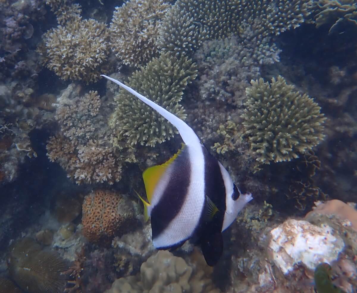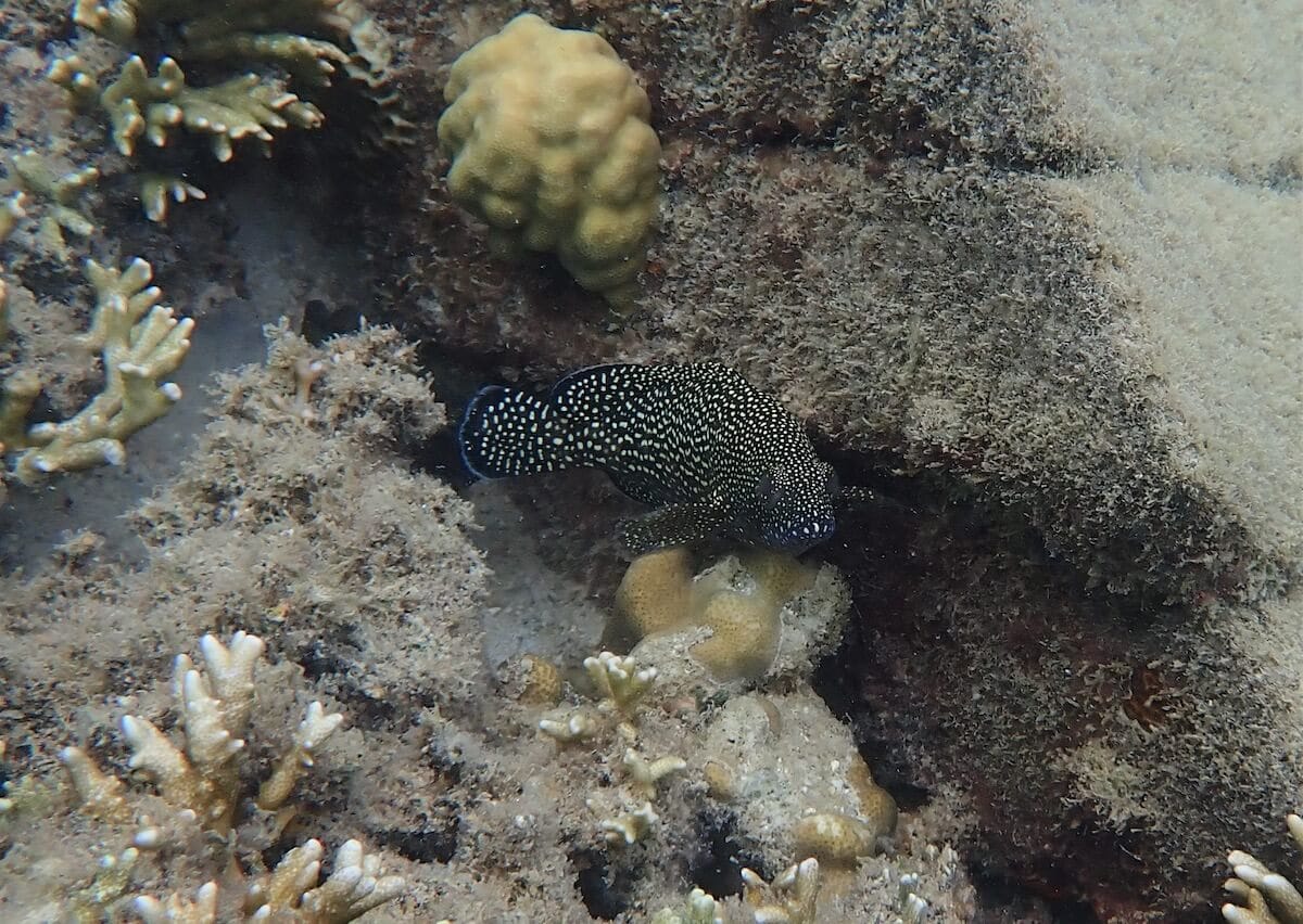 Les coraux de Tuna Bay sont globalement très abîmés. Même si certains massifs de coraux branchus, de Porites et de coraux digités sont encore en bonne santé, on traverse aussi de grandes zones de débris coralliens morts.
