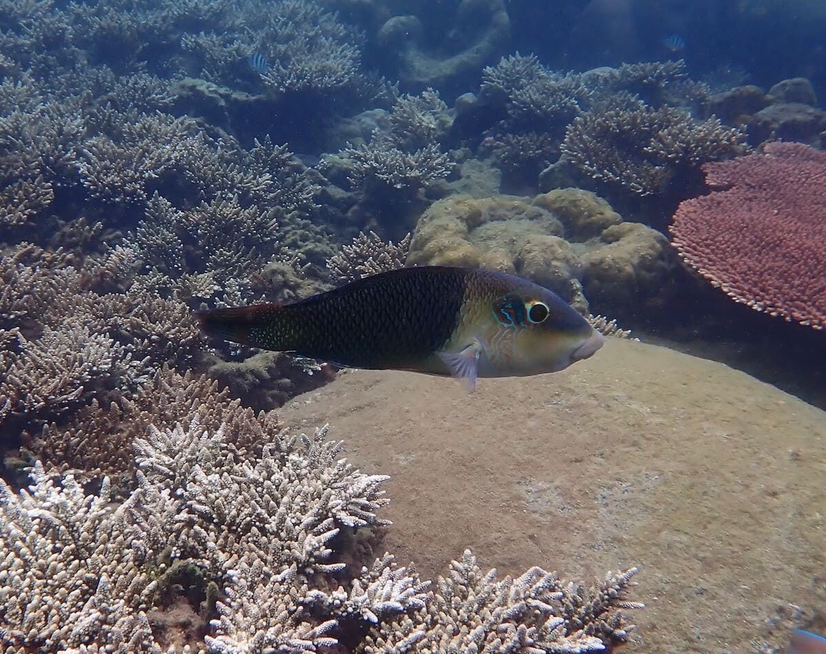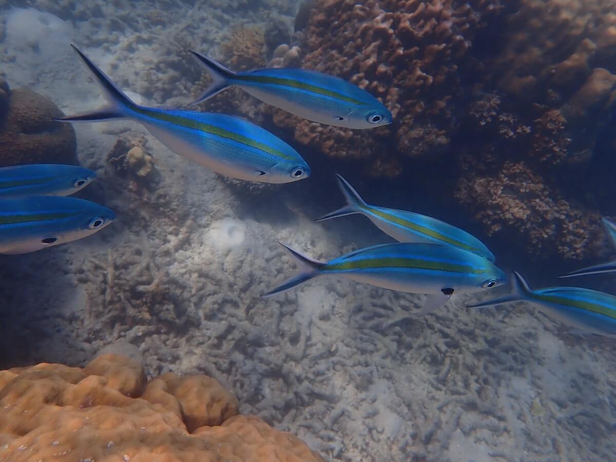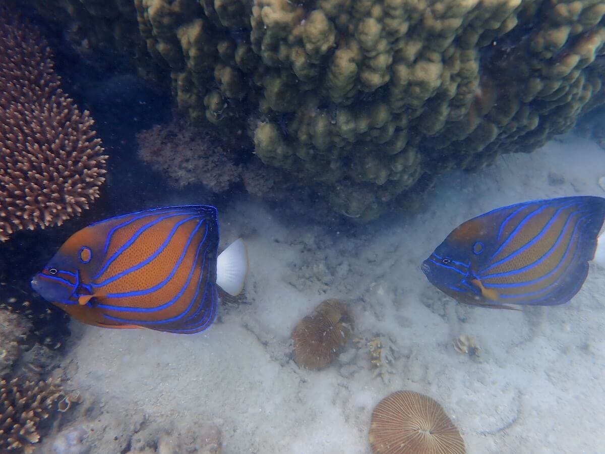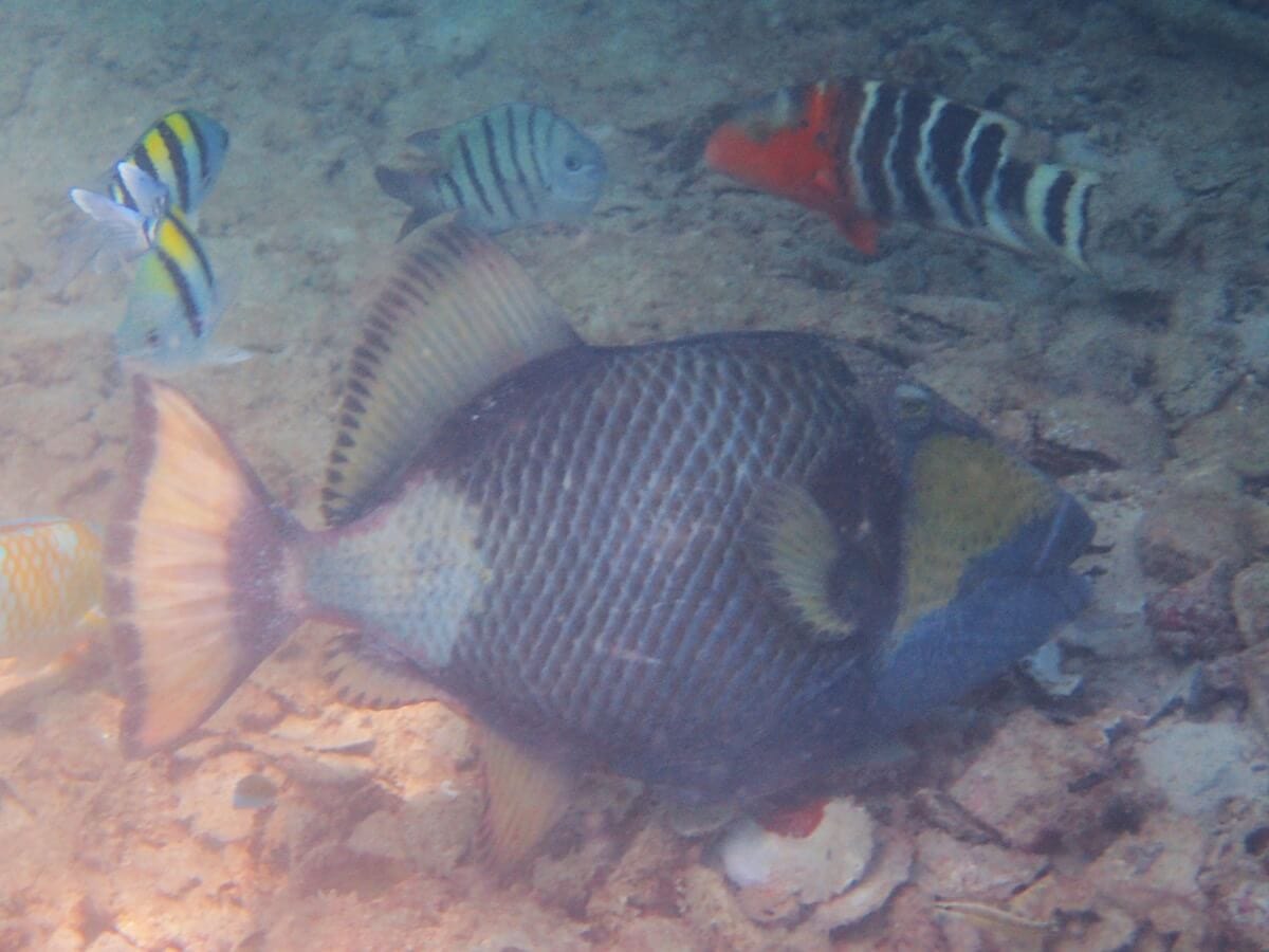 Parmi les autres poissons faciles à voir à Tuna Bay figurent aussi le très beau poisson-ange annelé, des poissons-lapins, des poissons-papillons, mais aussi des bancs impressionnants de poissons-perroquets à bosse qui viennent brouter le corail.