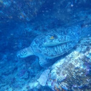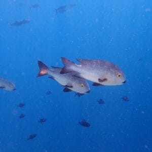 En longeant le tombant, vous pourrez aussi explorer deux milieux un peu plus spécifiques: les abords du ponton (où de nombreux poissons se cachent sous et autour des piliers), et le « canyon » qui se trouve à environ 180m au sud du ponton, où se rassemblent des vivaneaux minuit et d’énormes carangues bleues.