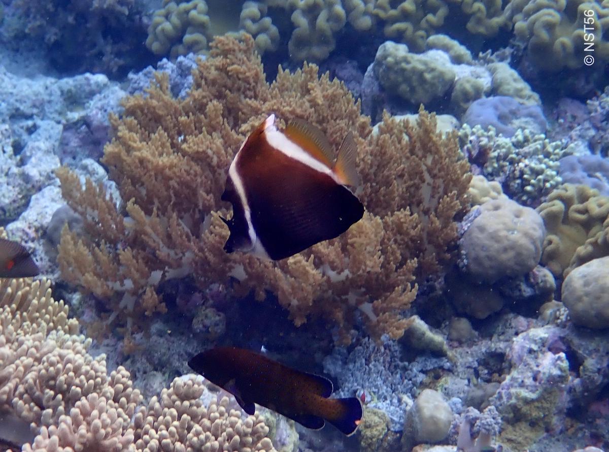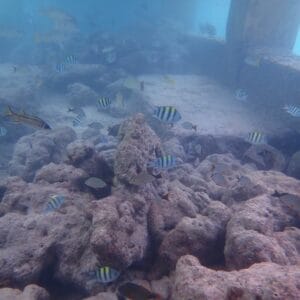 Dans ce paysage sous-marin spectaculaire, on rencontre une extraordinaire variété de poissons récifaux: une quinzaine d’espèces de poissons-papillons et cochers, des poissons-anges (poisson-ange amiral, poisson-ange empereur, poisson-ange duc), des chirurgiens (et notamment le magnifique chirurgien bleu), et de nombreux autres poissons tout aussi colorés. Au moins 5 espèces de poissons-clowns sont présentes autour de la jetée (voir liste complète en bas de page).