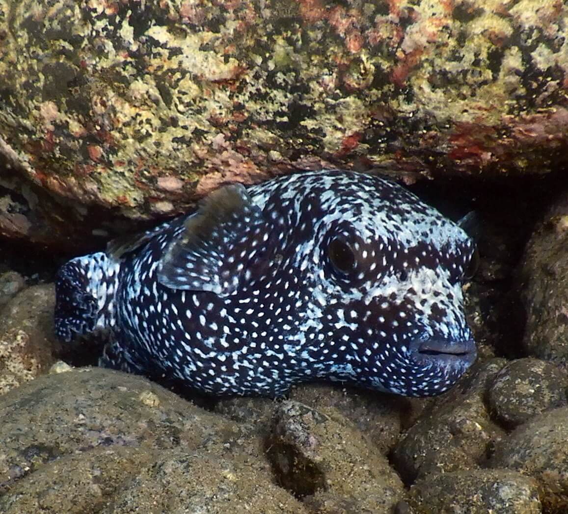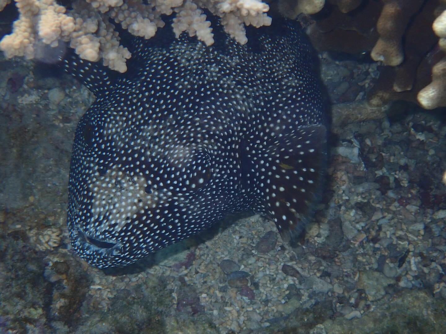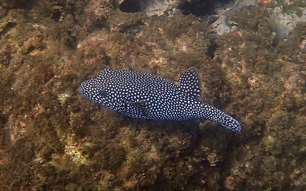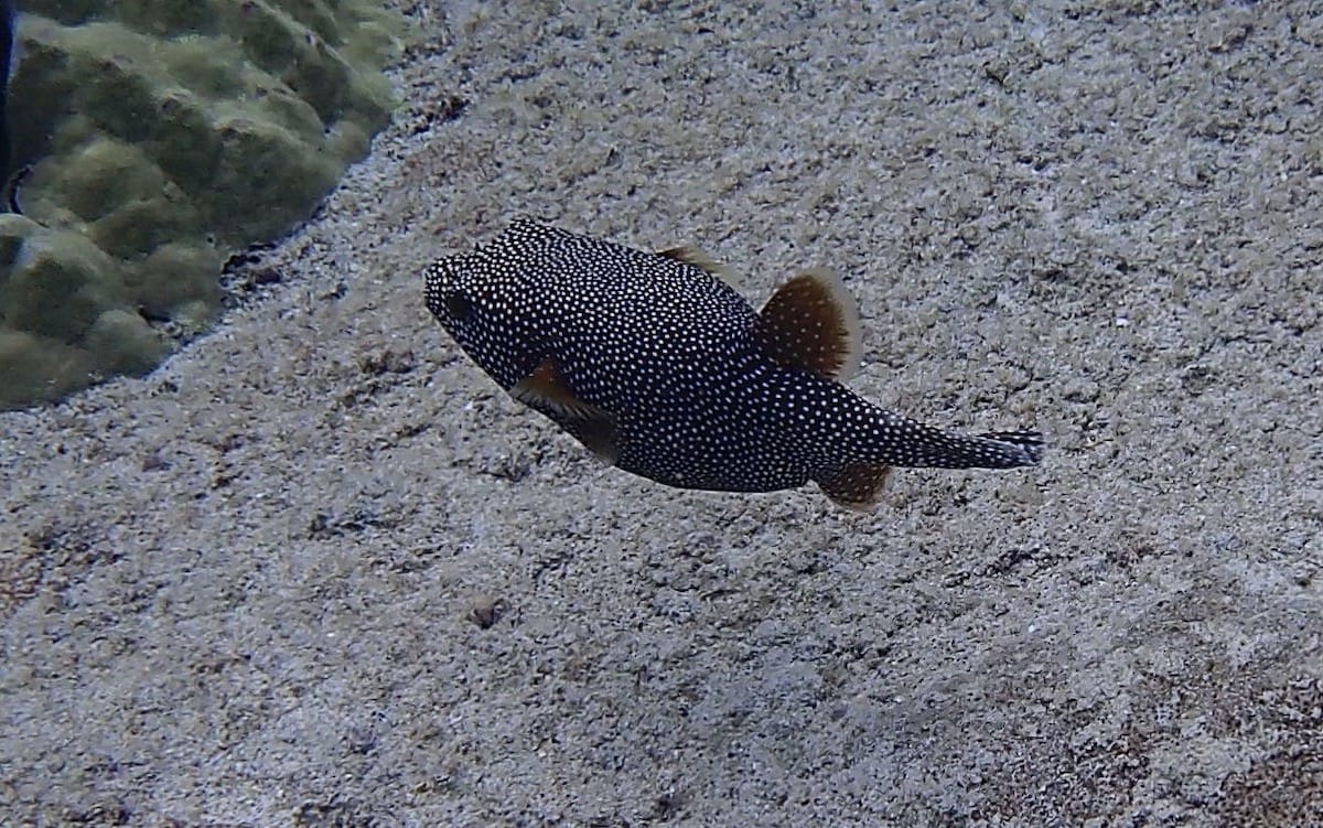 Arothron meleagris have two main forms, black with numerous small white spots or bright yellow. Some individuals coloration is a mixture of the two forms.