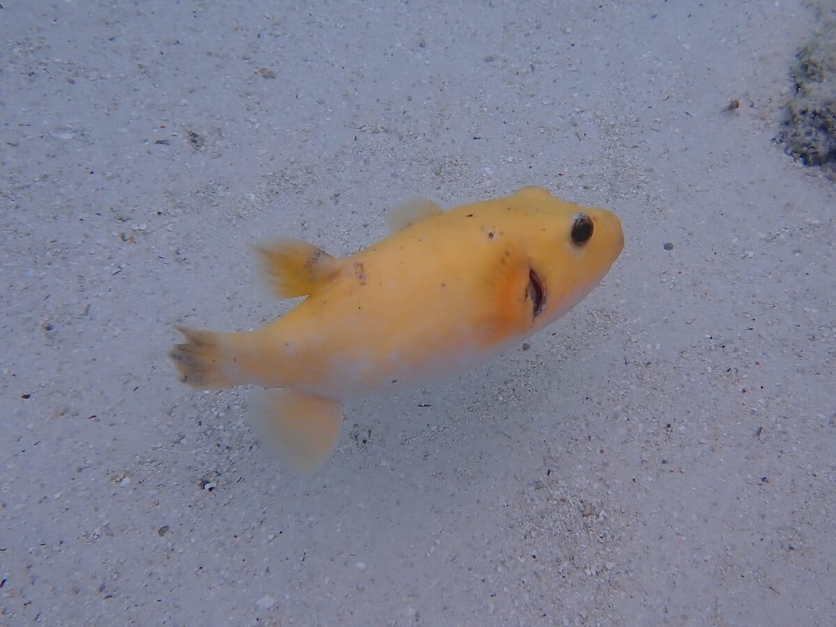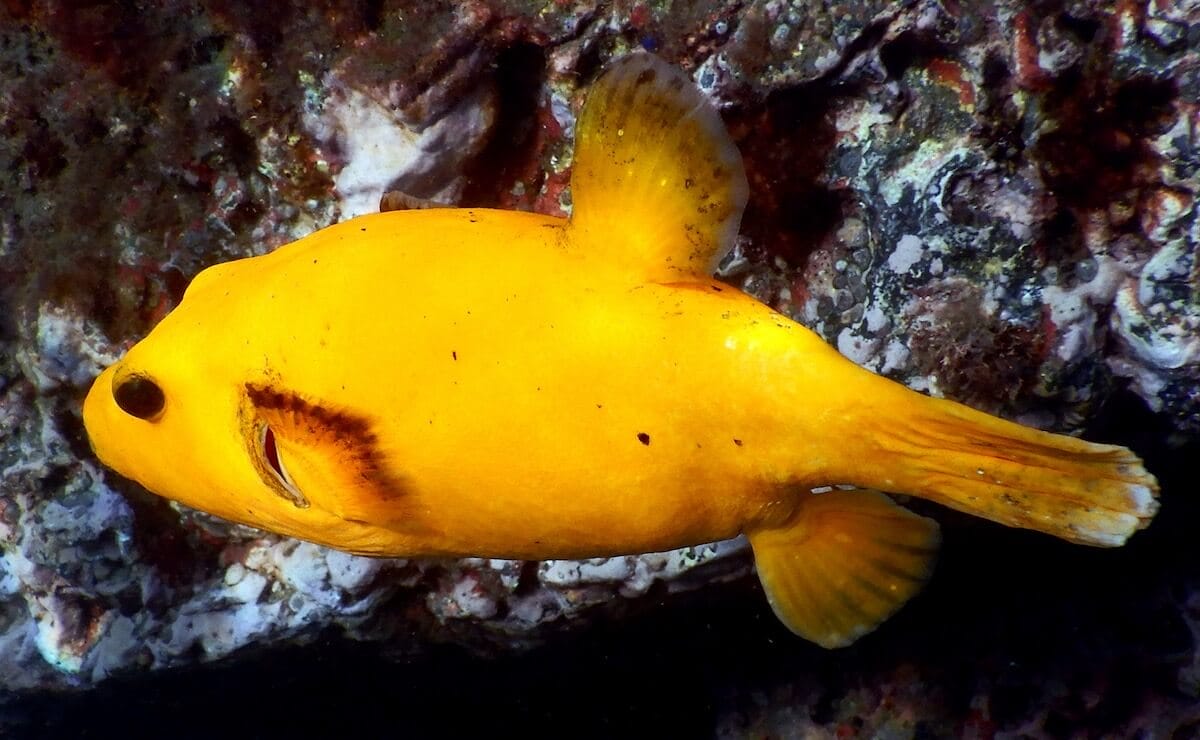 In its yellow coloration, frequently confused with Arothron nigropunctatus.