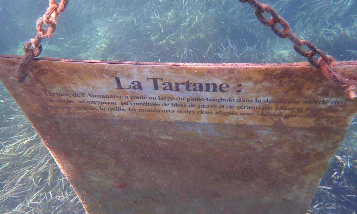 La Tartane sank with its cargo of stones, but parts of the wooden hull and keel are still visible. The position of the wreck is indicated by an orange buoy.