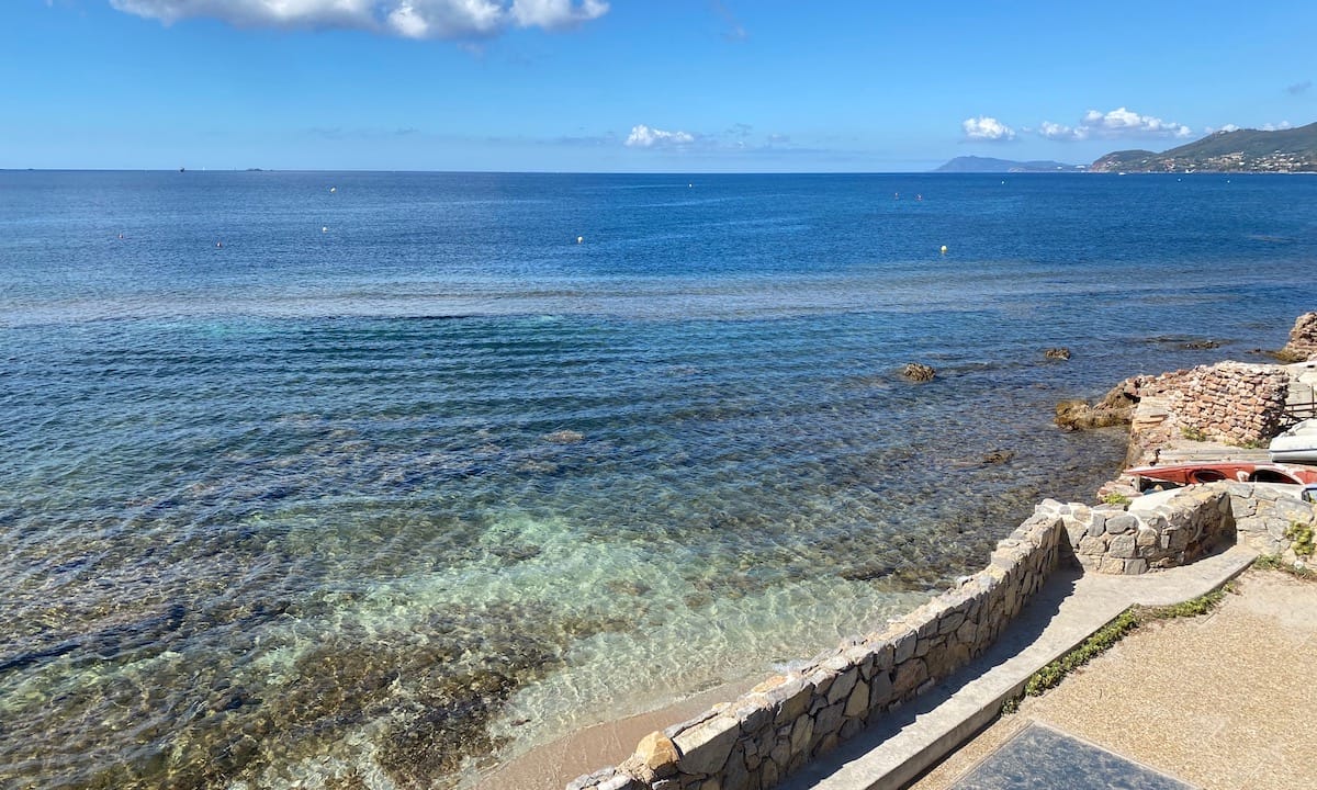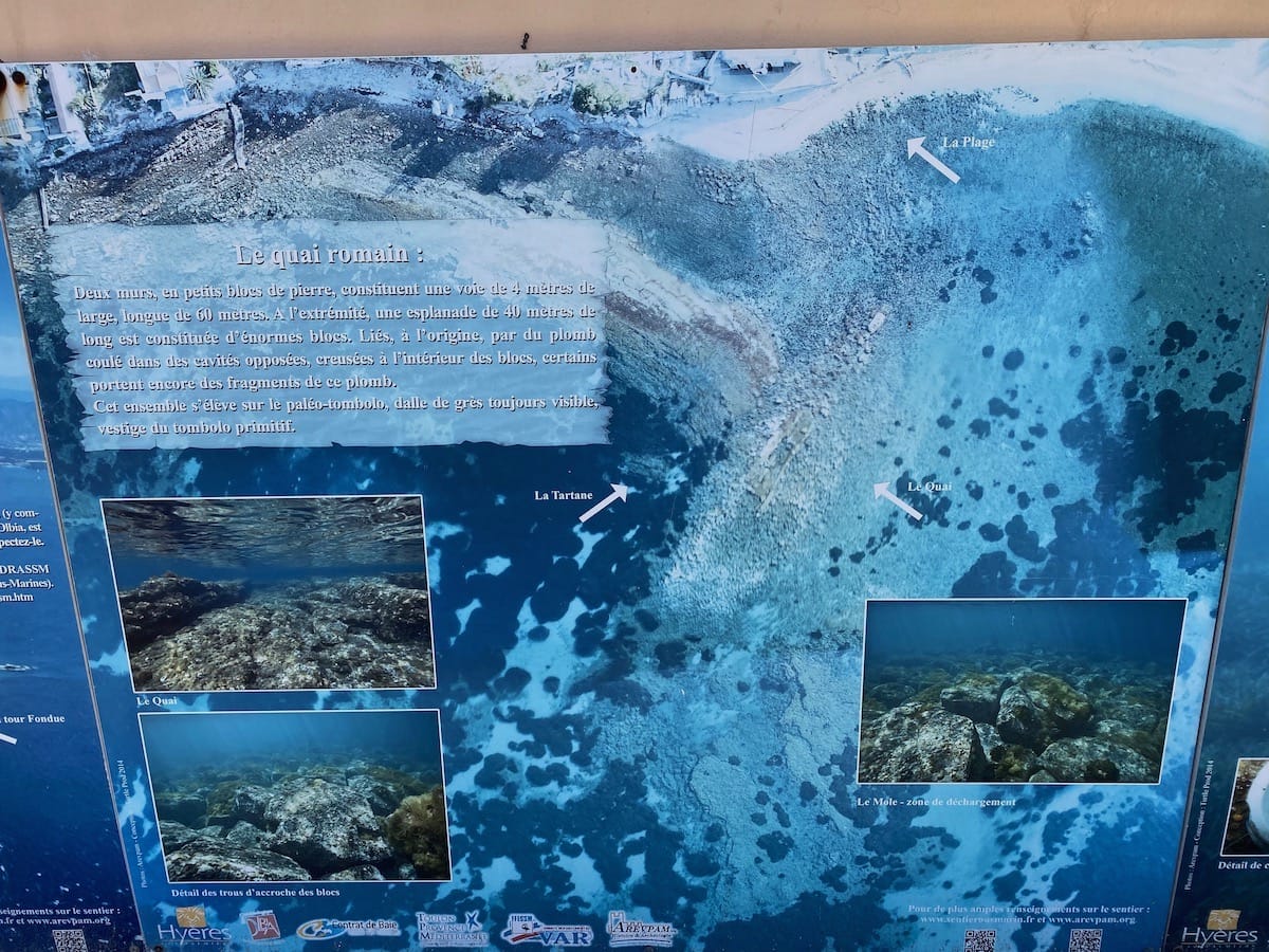 Get in the water from the north end of Almanarre beach, a little after Le Robinson restaurant. You will find yourself right in front of the area where the Roman ruins and the wreck are located.