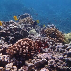 In all the snorkeling area, you will see impressive coral formations. Multi-colored coral (Acropora, etc.) cover the often abrupt volcanic rocks. Everywhere, sea urchins, including the spectacular red pencil urchin, have made a home in the crevices.