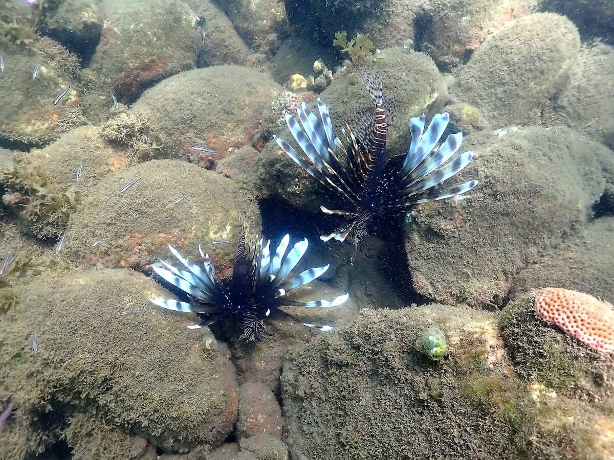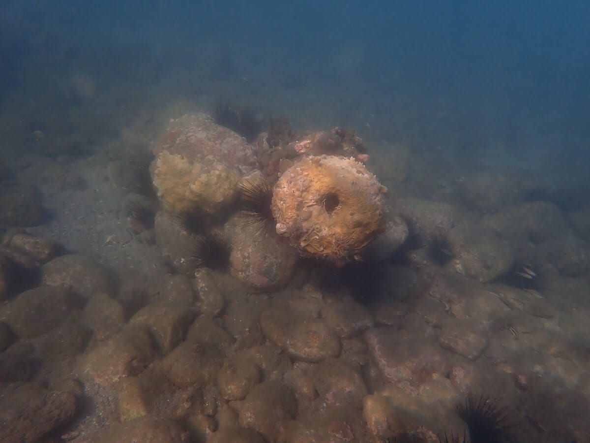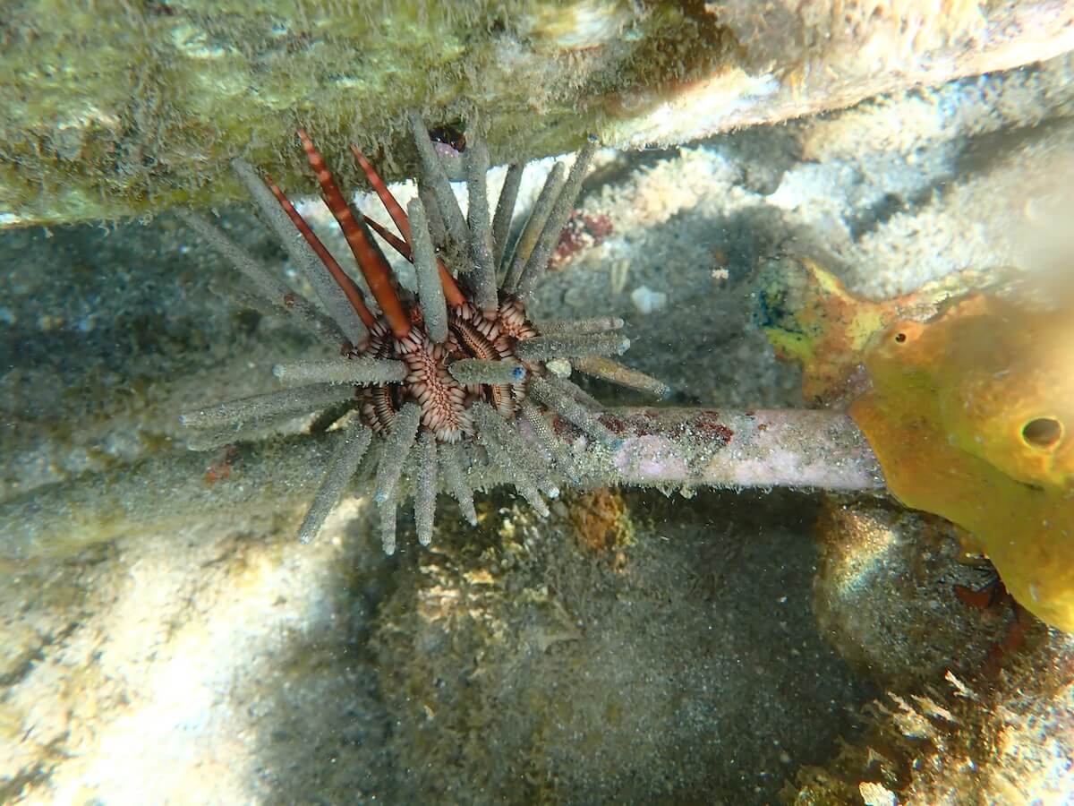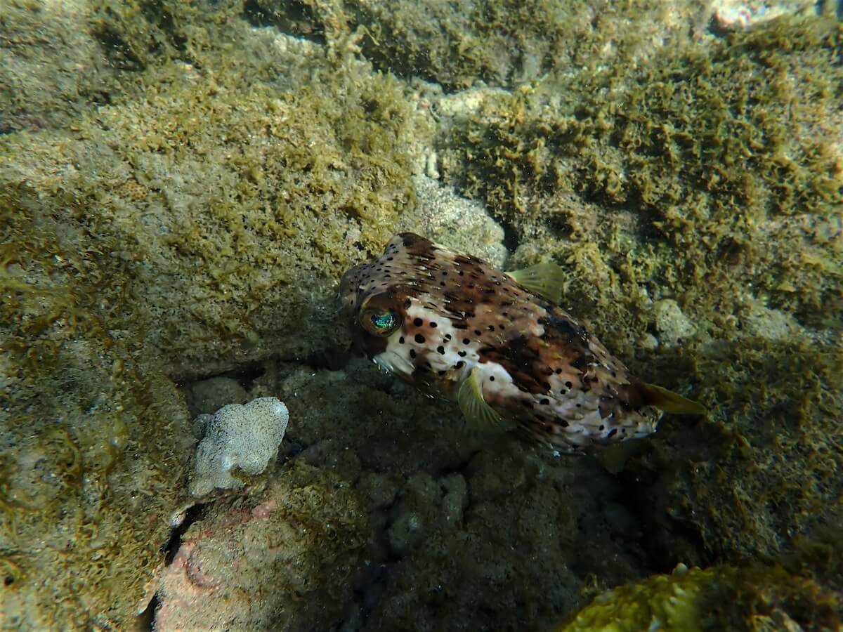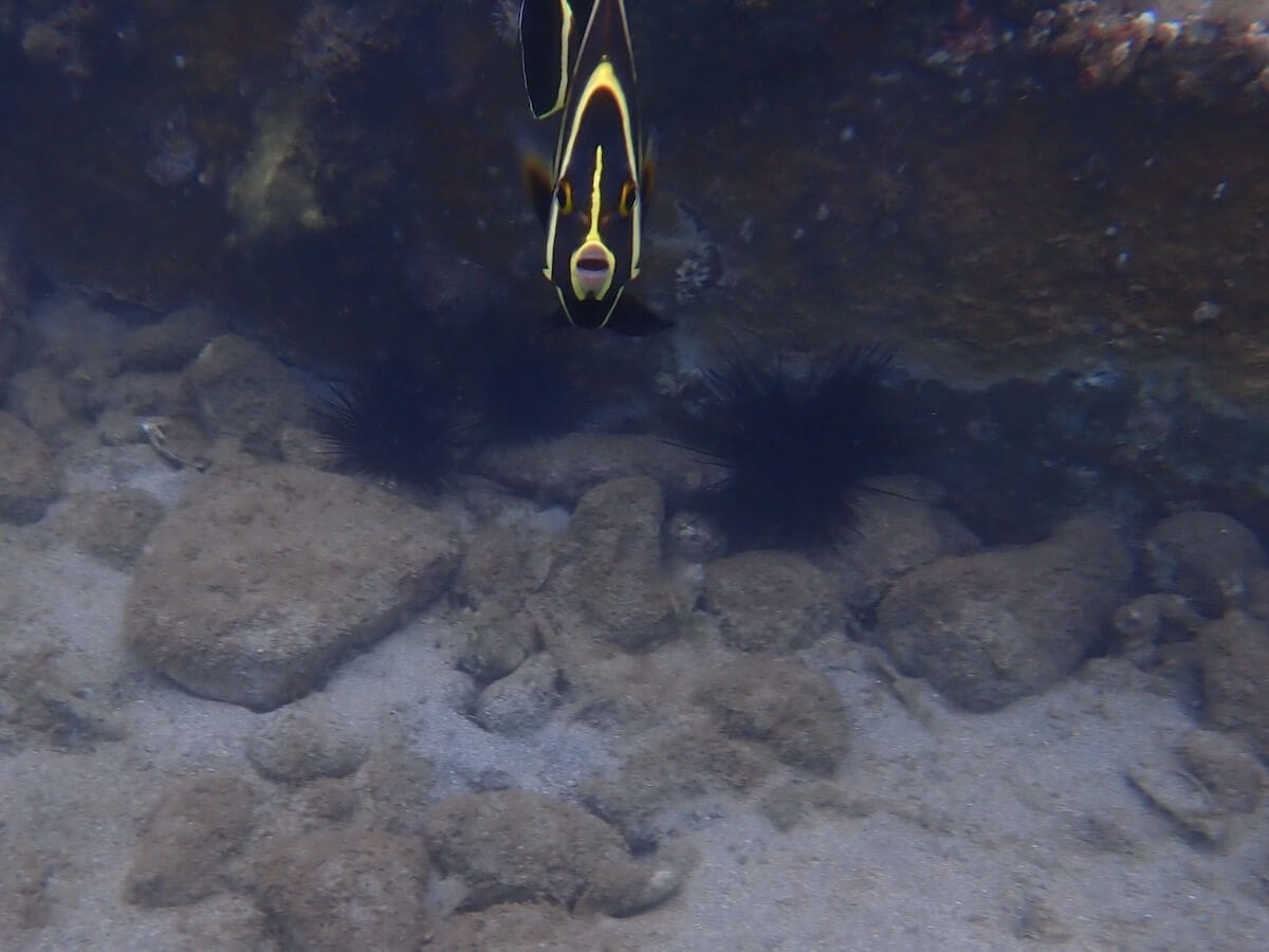 Different species of sea urchins, such as the slate pencil urchin, the variegated urchin and the rock boring urchin, live on the rocks. This environment, which offers many hiding places, is called home by pufferfish, porcupinefish and boxfish. Dozens of other species are common on this spot, including the French angelfish, one of the most beautiful fish in the Caribbean.