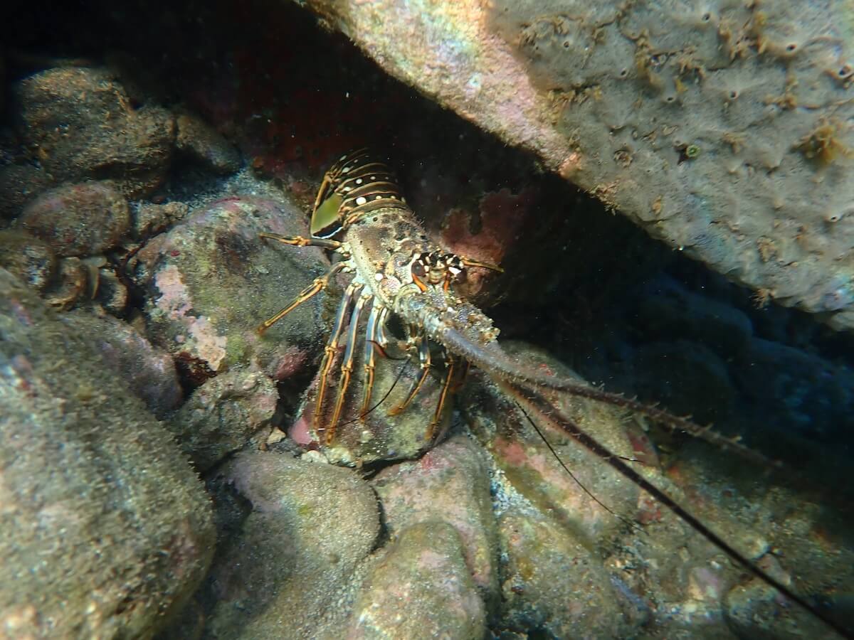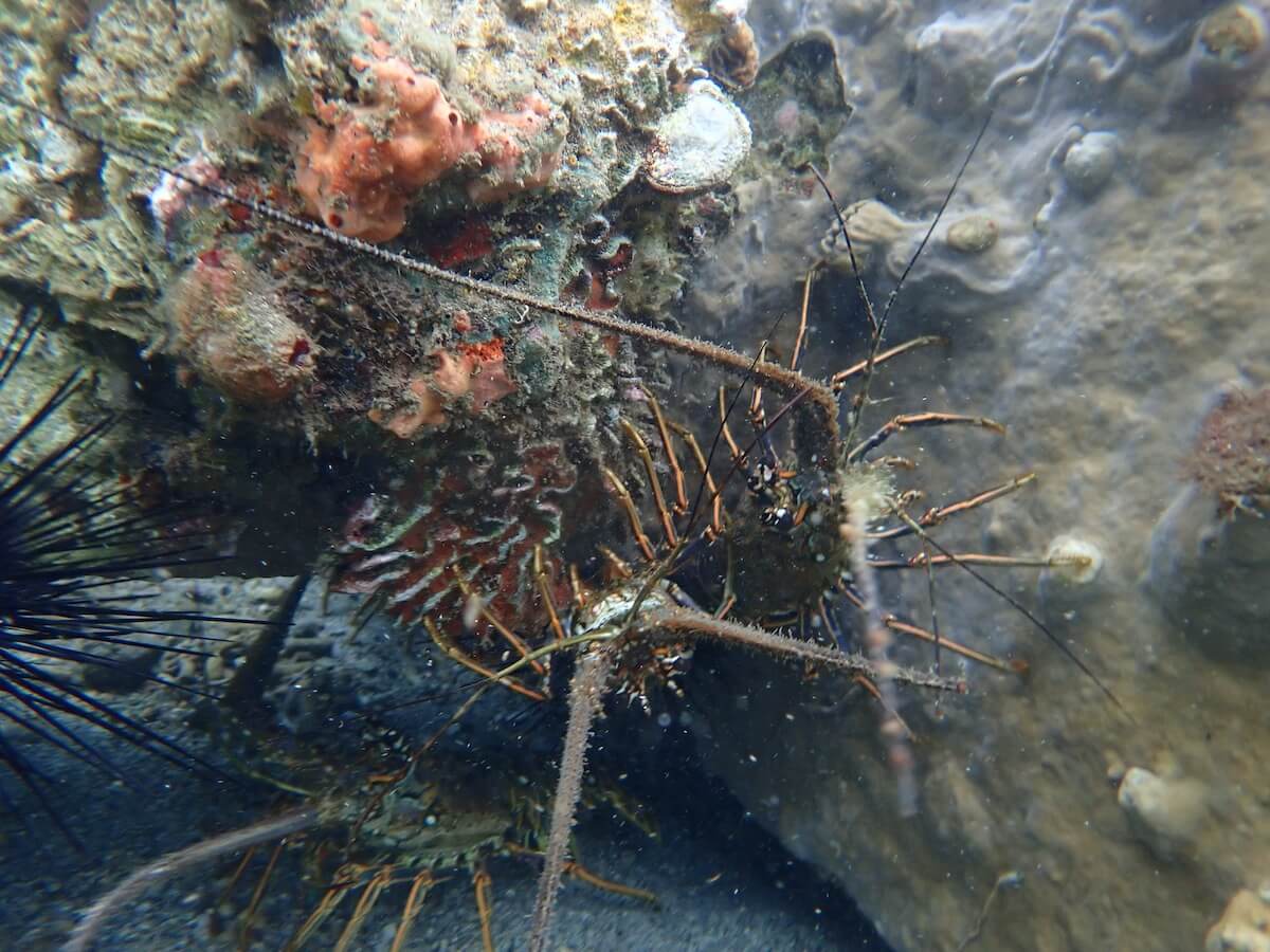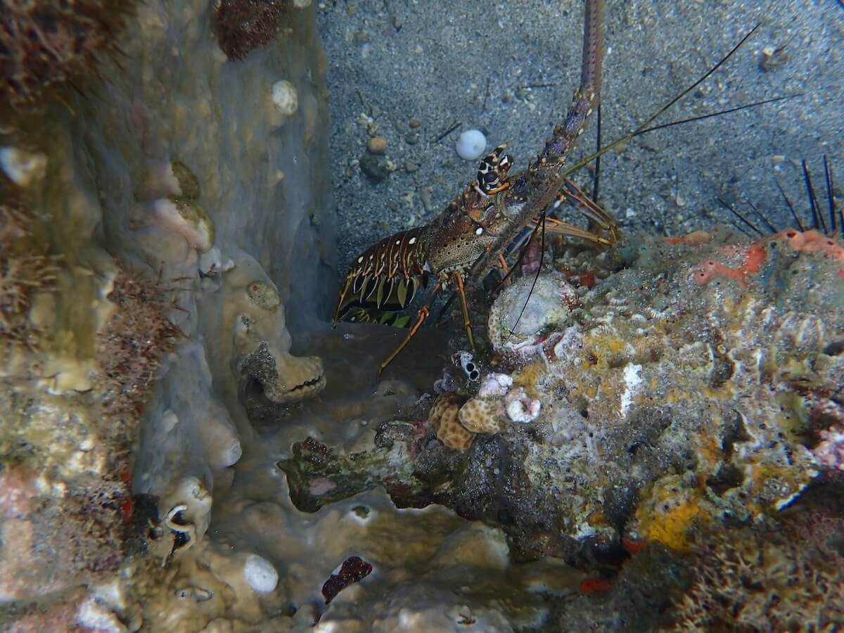 Once in the water, first follow the old railway, looking for the small lobsters that sometimes hide there (↕1-3ft/0.5-1m). Some small fish also shelter in this shallow area.