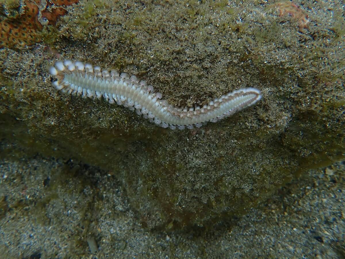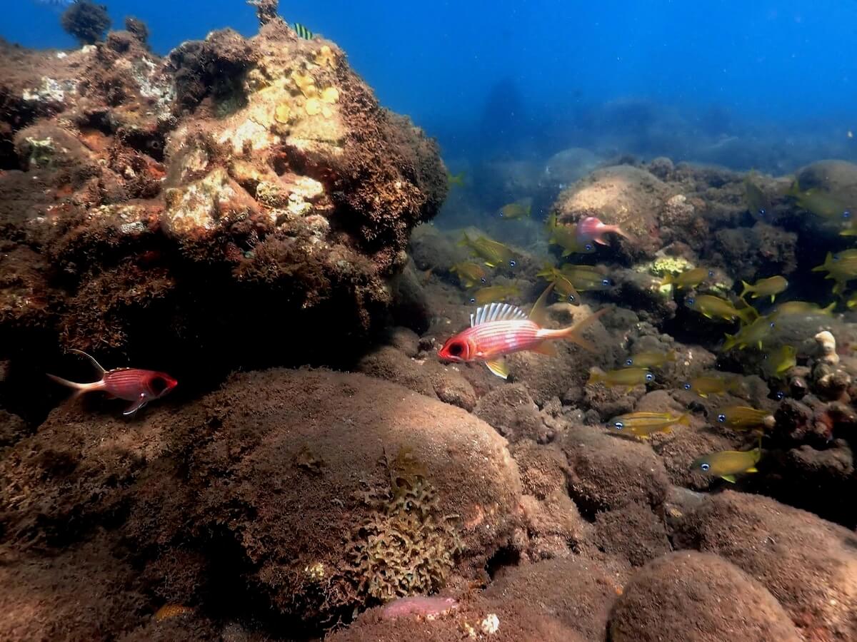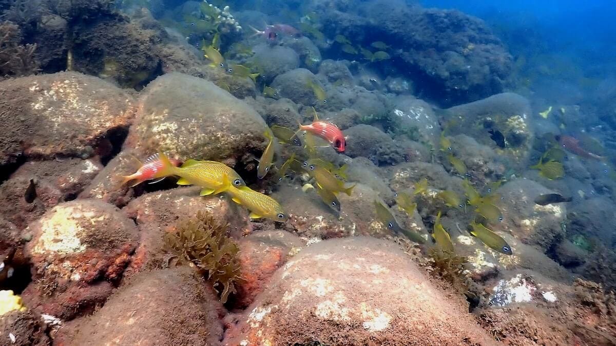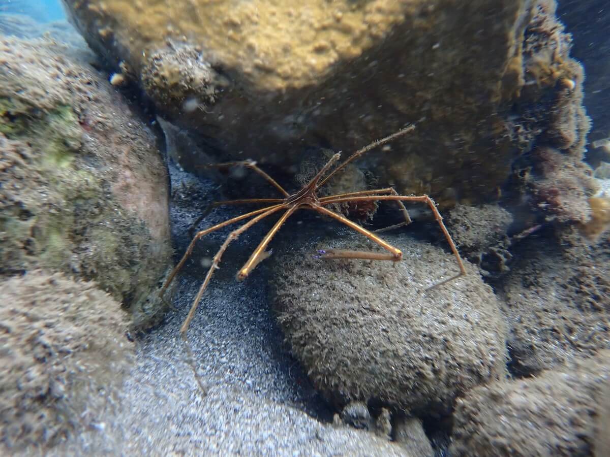 Once in the water, first follow the old railway, looking for the small lobsters that sometimes hide there (↕1-3ft/0.5-1m). Some small fish also shelter in this shallow area.