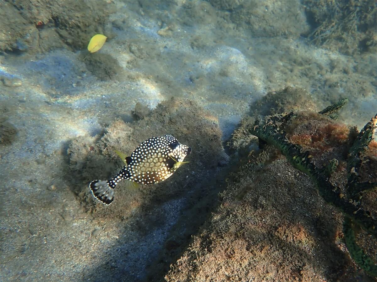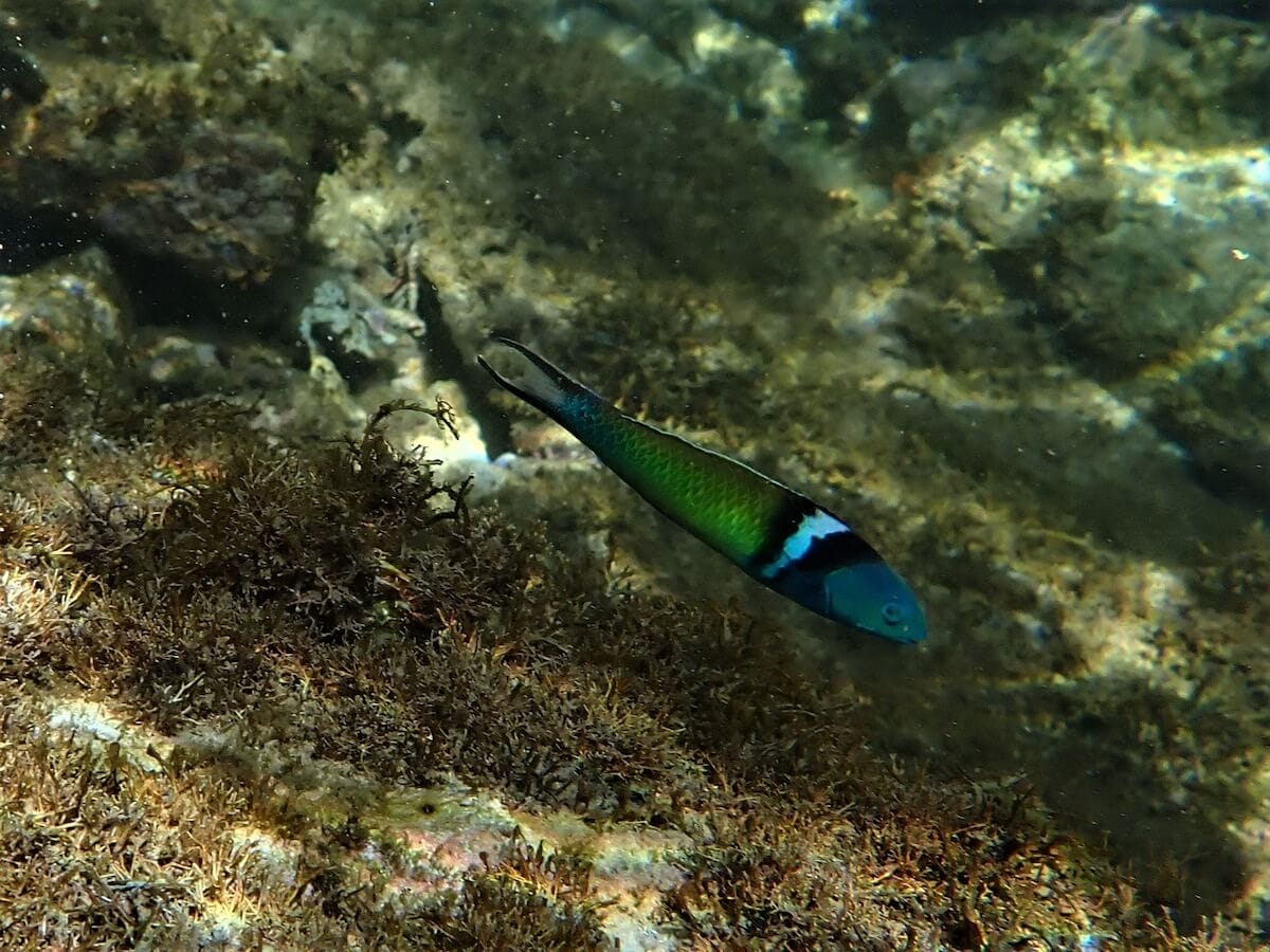 After admiring the wrecks, head towards the north shore of the bay (on your right as you look out to sea) to check out the local underwater life. Its rocky bottoms, on which a few hard corals live, are teeming with life.