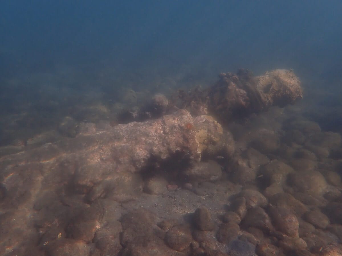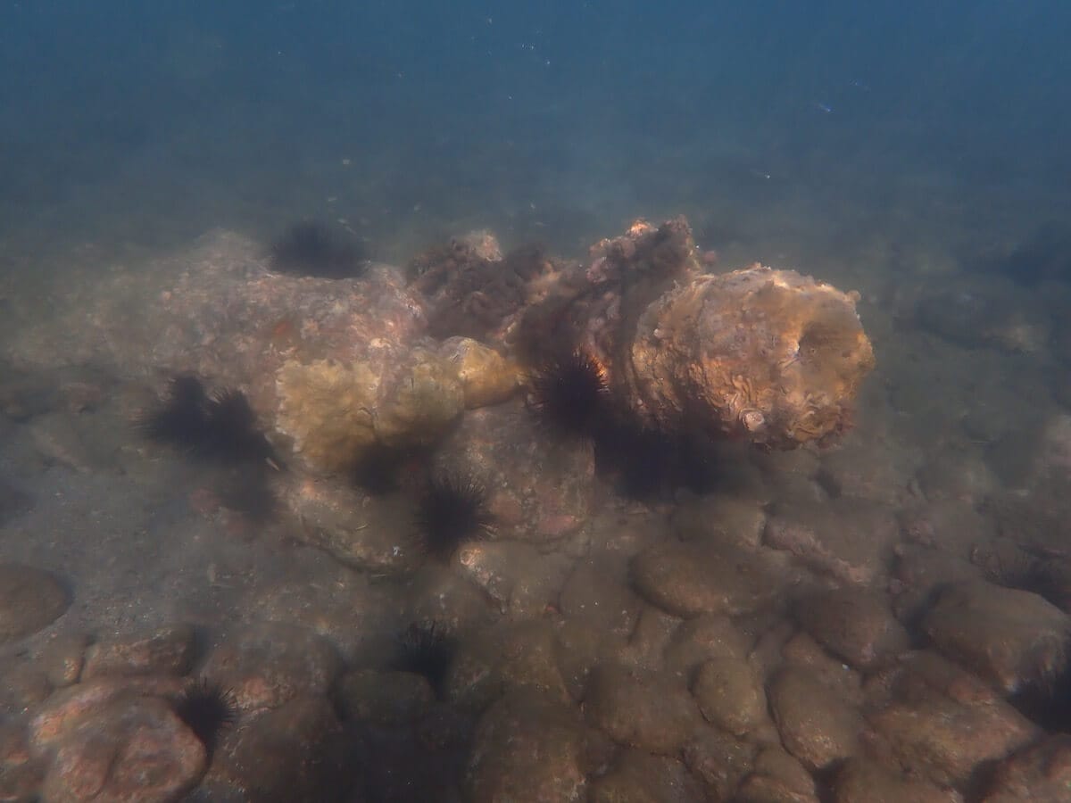 When the rails come to an end, keep swimming straight ahead. You will then easily find the two famous cannons sunk about 50m from the shore (↕5ft/1.5m).
