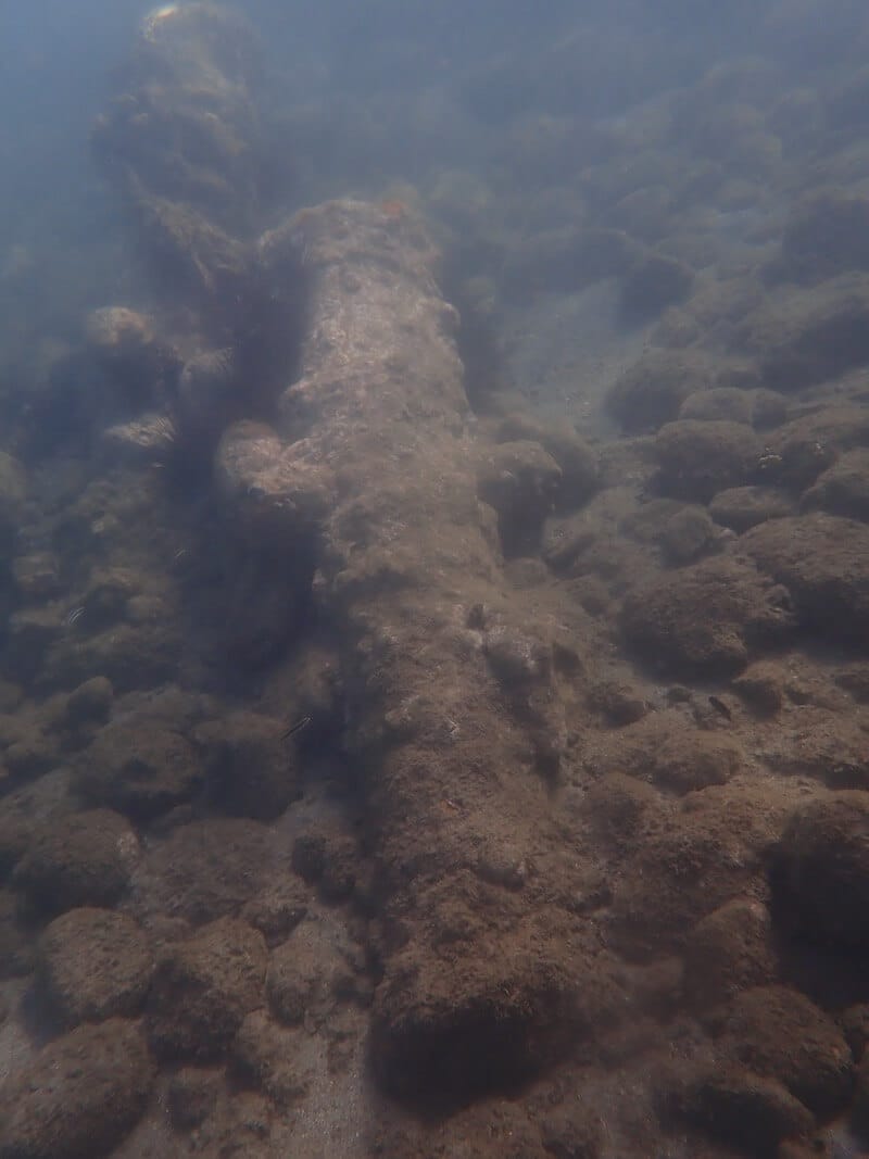 These are among the remains of several Napoleonic wrecks sunk in the bay. Continuing for a few tens of meters, you will be able to discover other parts, such as masts and pieces of frameworks.