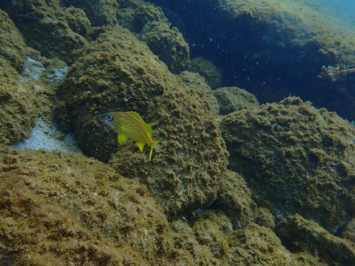 If the right side of the bay is the most lively, the whole bay can be explored by slaloming between the anchored boats. The sea is calm in the cove, where there is almost never a current. The main danger comes from the small fishing boat traffic between the mooring area and the open sea. The underwater visibility is at its best in the morning.