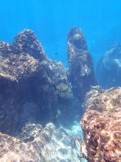 The main snorkeling area edges the cove, and is made of huge granite blocks immersed in 12 to 20ft of water (4 to 6 meters). This underwaterscape, with ray of lights of the sun breaking through the deep blue sea, is amazing.