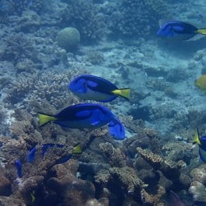 Shoals of palette surgeonfish, aka Dory, are often seen along the slopes of the reef.