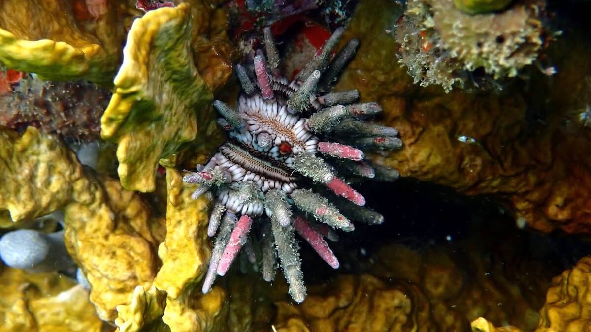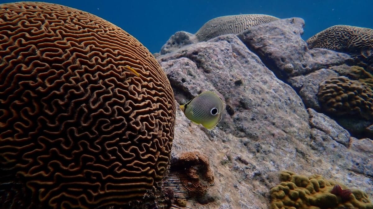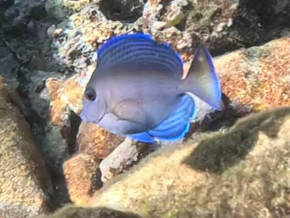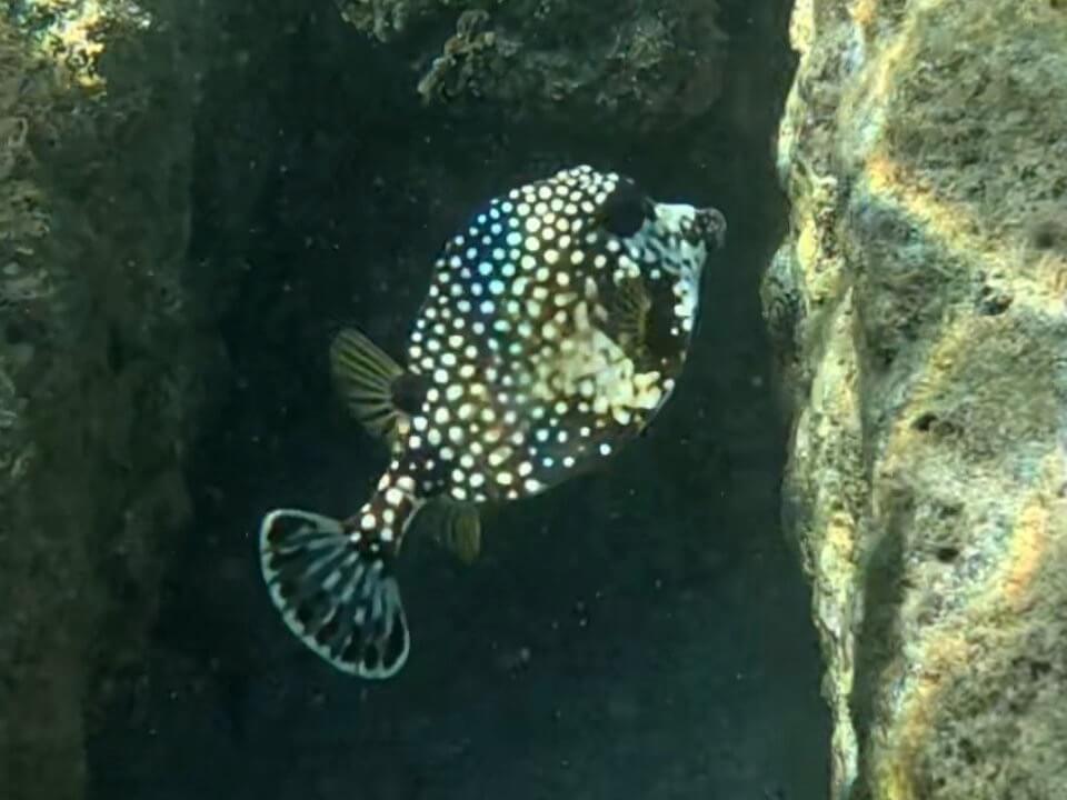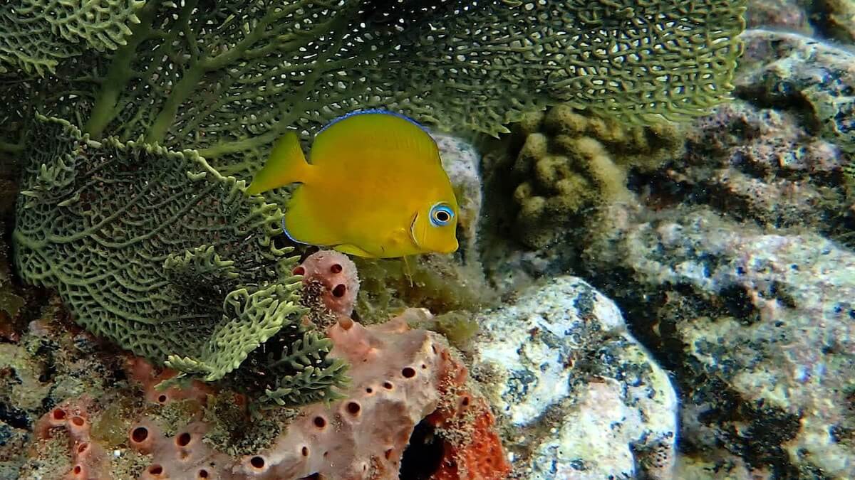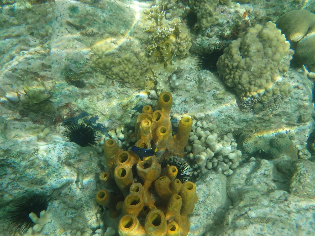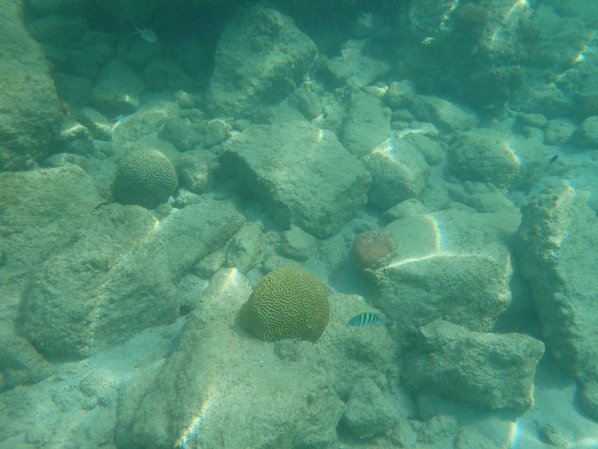 On both sides of the beach are rocky areas (↕1-12ft/0.5-4m), with more varied underwater life. Sponges are attached to the rocks, a few corals, and countless sea urchins. While snorkeling in these areas, you will spot many fish, such as the bluehead wrasse, sergeant majors, parrotfish, and yellowtail damselfish.