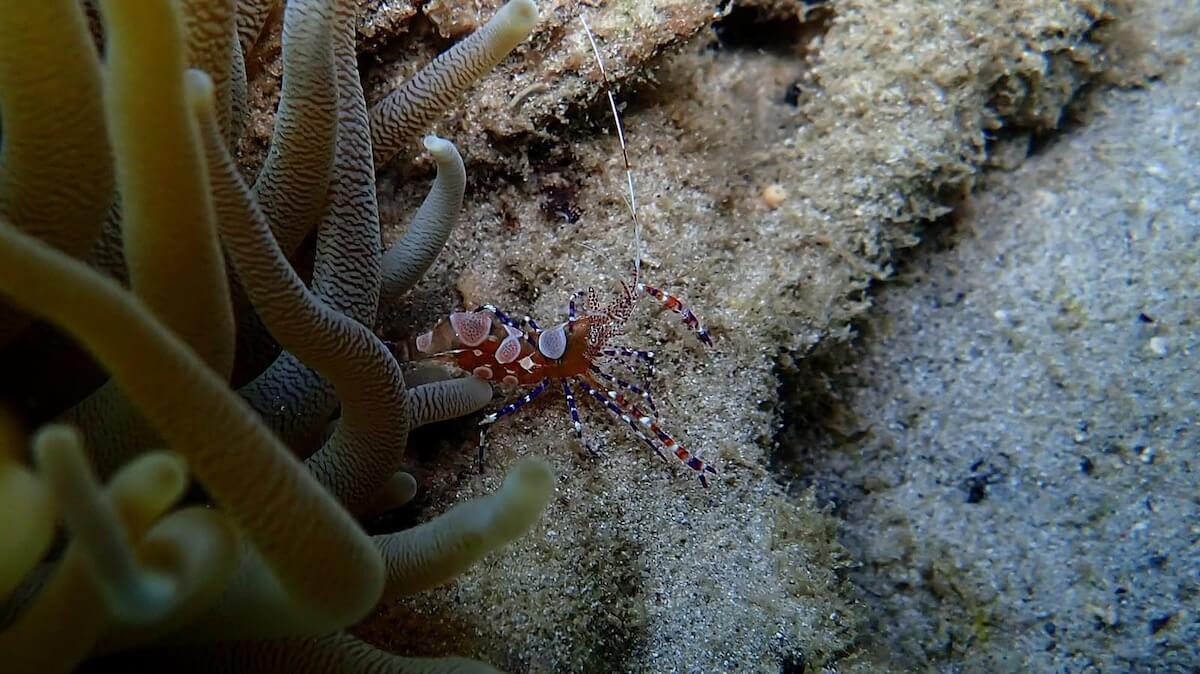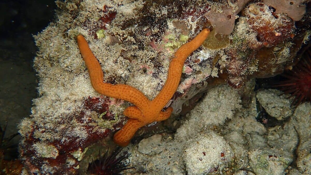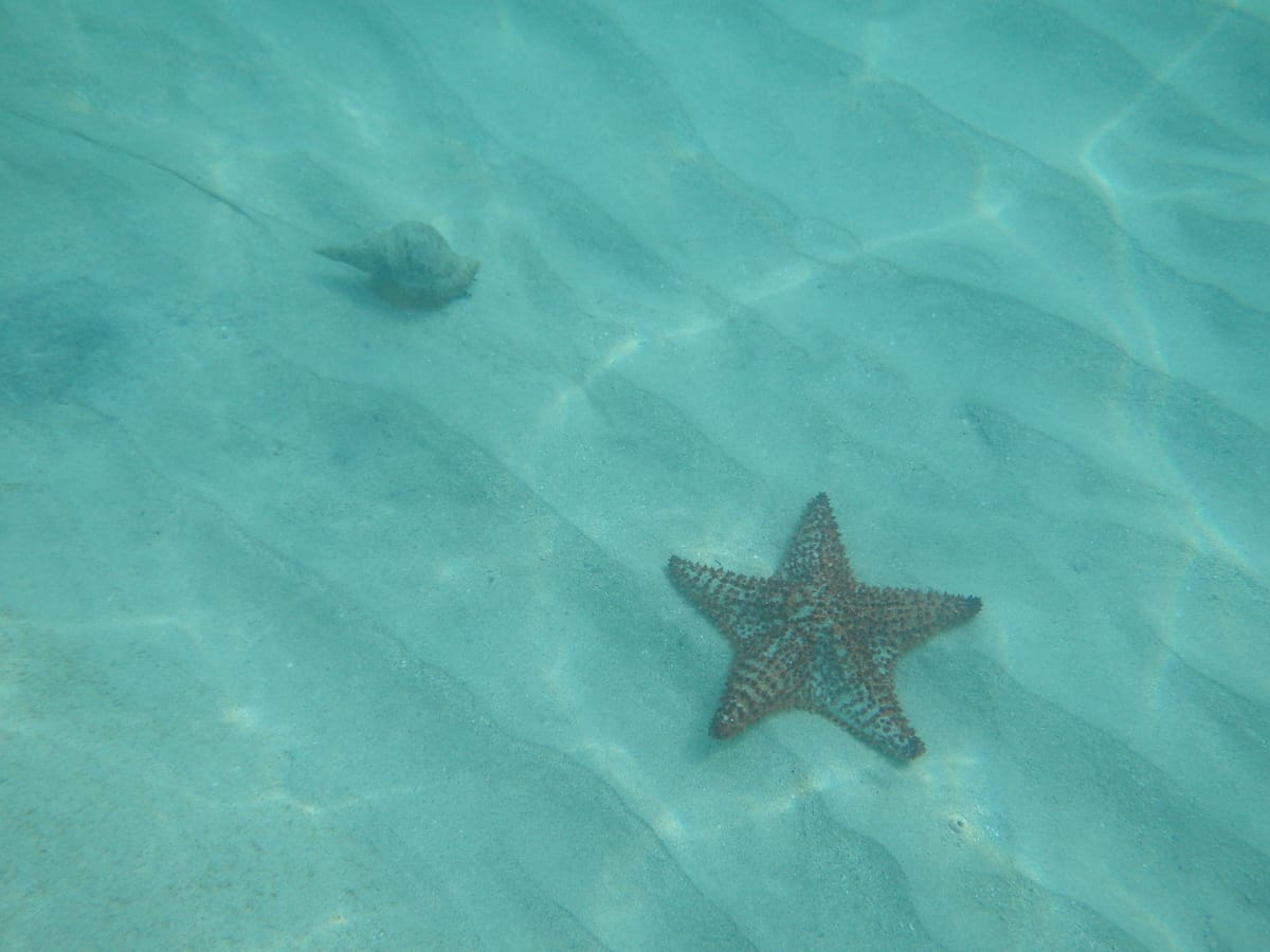 You can snorkel all over the cove. Opposite the beach, you’ll mainly explore shallow sandy bottoms (↕1-6ft/0.5-2m). They are home to few fish, but you can also see a few cushion starfish.