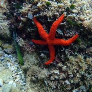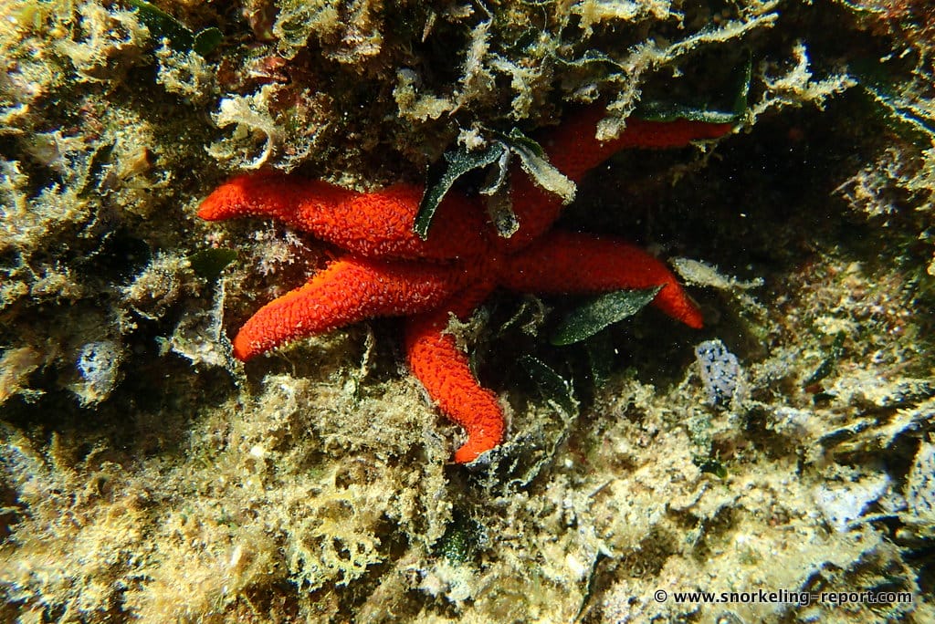 Since fishing is forbidden in the bay, small octopuses are commonplace in its rocky areas. Mediterranean red starfish are particularly numerous on this spot, you won’t miss them.