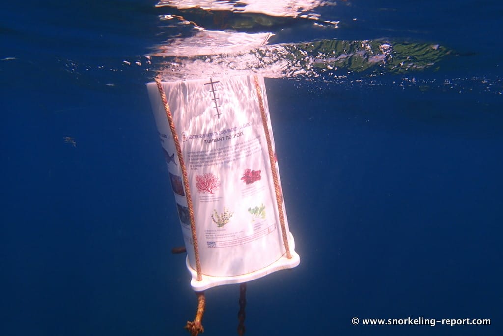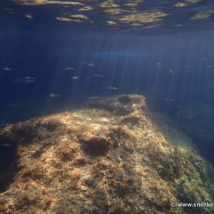 The underwater path is a very convenient and enjoyable way to discover the spot, but you are of course free to explore the whole snorkeling area the way you prefer. The rocks emerging at the center of the bay (↕10-20ft/3-6m) and the rocky seabed facing the beach (↕2-6ft/0,5-2m) are also interesting to explore.