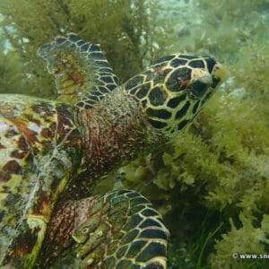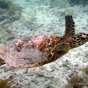 A diversity of fish lives in the seagrass and the rocks areas, including parrotfish and butterflyfish. Look for the beautiful red-knobbed starfish, which hide in the dense seagrass covering the seabed. Immature hawksbill sea turtles are also a frequent visitor to Anse Volbert, where they like to feed and rest.