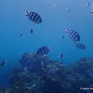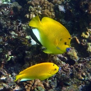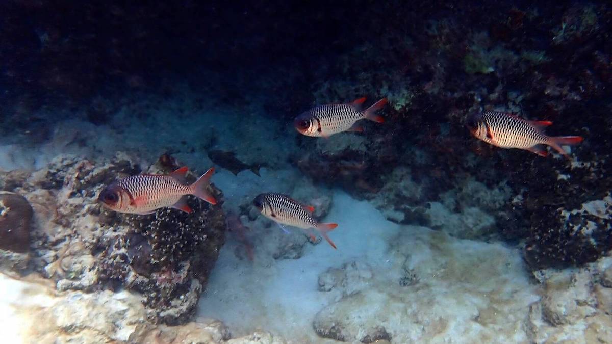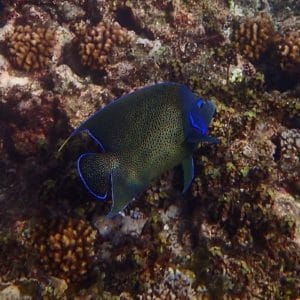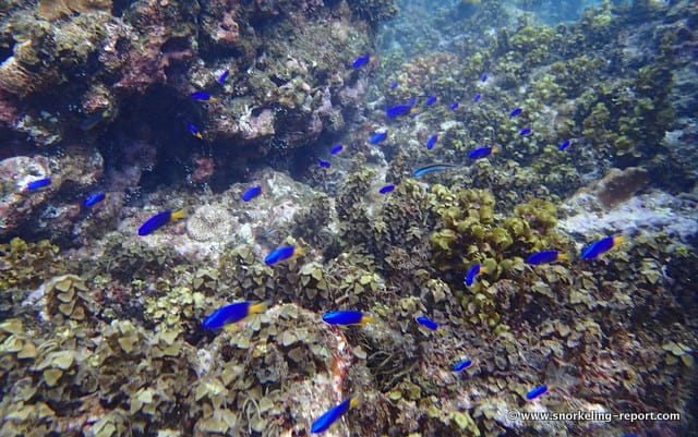The reef flat is shallow but inhabited by multitudes of hard coral. Their condition varies (in some places the sea bed has none). As you explore, it is easy to come across several species of angelfish (semicircle, threespot and emperor), a large number of butterflyfish and particularly colorful surgeonfish.
