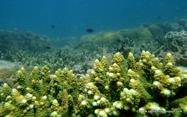 The recommended snorkeling area comprises the coral reefs fringing the beach, to the north and the south of the mooring area.
