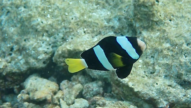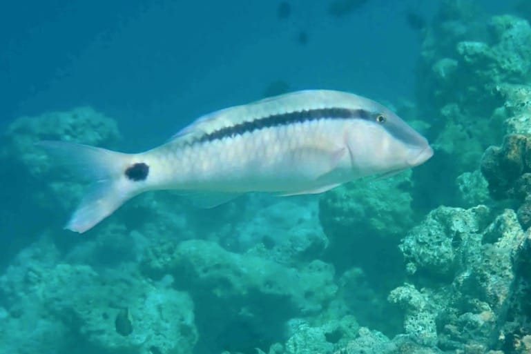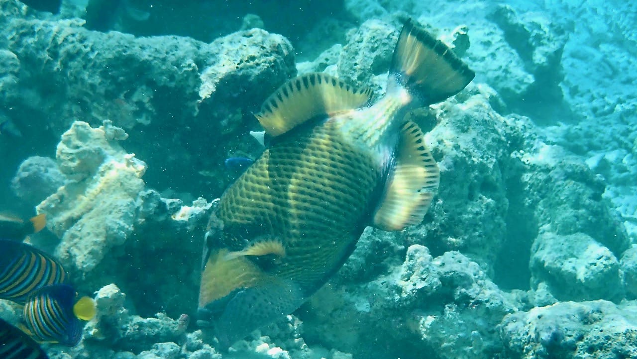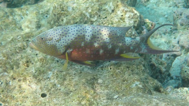 As you snorkel, you will come across dozens of species of small, colorful reef fish (angelfish, butterflyfish, clownfish, tangs), groupers (notably the superb yellow-edged lyretail and bluespotted grouper), as well as octopus and squid. In the blue or on the reef flat, expect to encounter blacktip and whitetip reef sharks. You are more likely to see them at passage 6 at the start and end of the day.