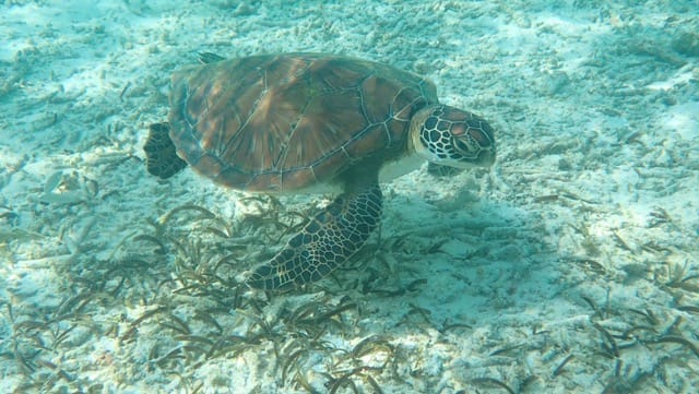 When the water level is high enough, snorkeling is worthwhile in the flats off the beach, especially in the seagrass beds in the west of the island (↕0.5-1.5m). Green turtles are frequently seen feeding in this area, plus you get to see some fish that prefer the flats, such as juvenile triggerfish, wrasses and snubnose pompano.
