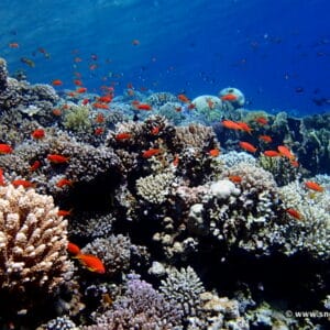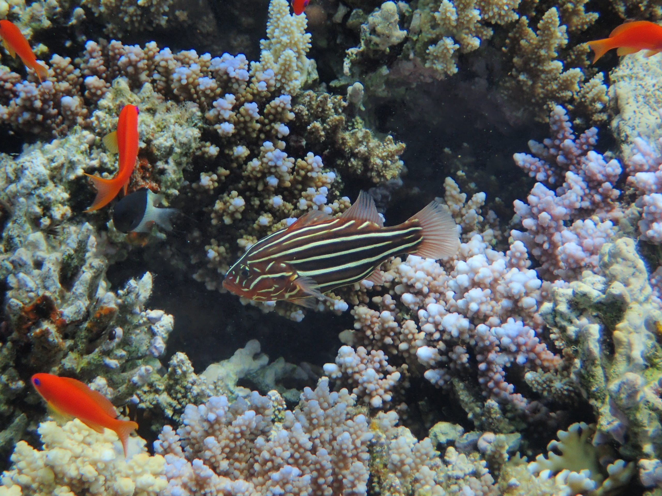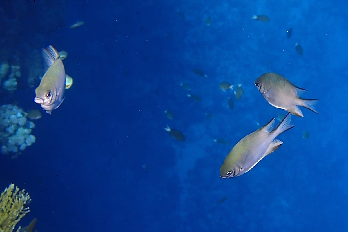Thousands of sea goldie take shelter around the coral, and a wide range of interesting fish, such as angelfish, clownfish in their sea anemone, wrasse and groupers can be seen here. In the Blue Hole, there are no strong currents and the water is calm, clear and warm.